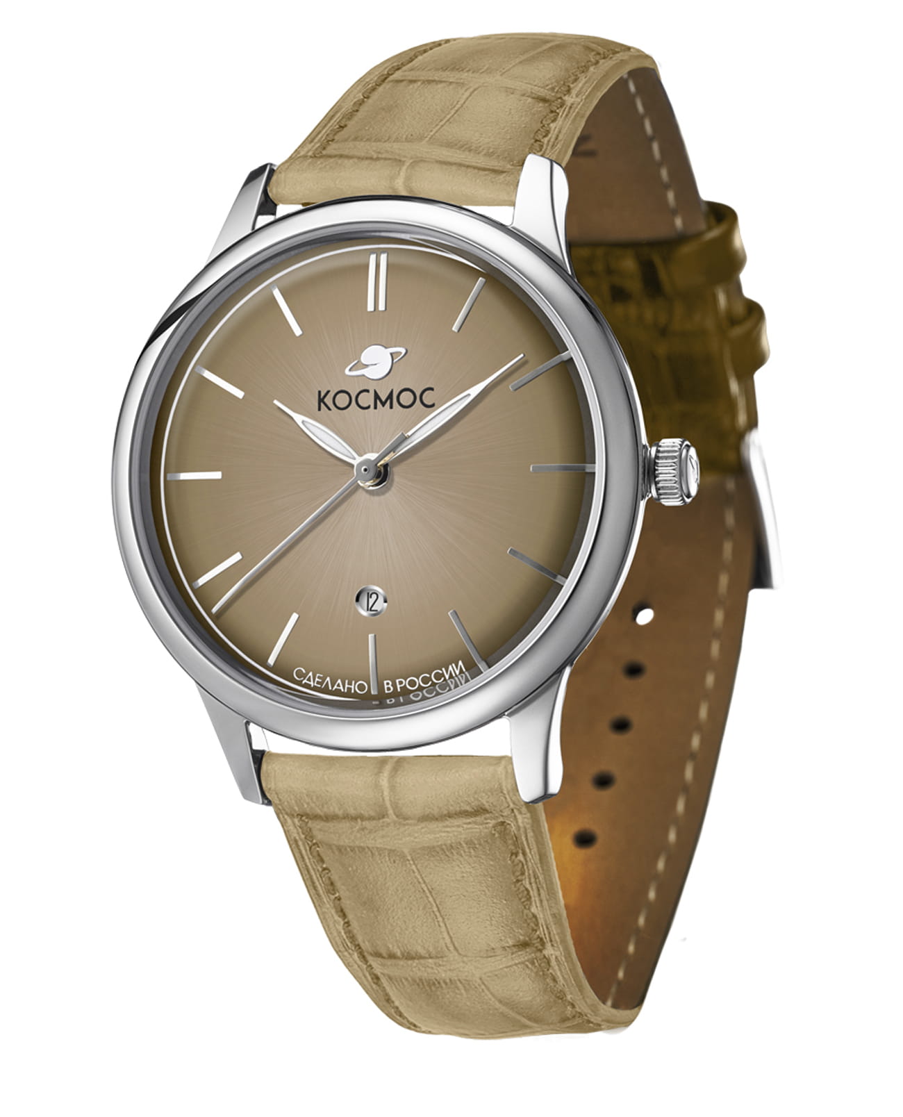 Женские наручные часы Космос Созвездие K 601.12.32 — это сочетание традиций часового искусства 60-70-х годов и футуристического дизайна, вдохновленного космическими исследованиями. Они не только служат напоминанием о прошлом, но и побуждают задуматься о будущем, позволяя наслаждаться качеством и смыслом, вложенными в каждую деталь. Полированный корпус часов выполнен в виде силуэта летающей тарелки благодаря выпуклым формам стекла и нижней части корпуса. Стальные ушки, которые напоминают опоры летающей тарелки, завершает общий образ. На задней крышке часов выгравирован фантазийный сюжет – космическая станция будущего. Название коллекции Созвездие – идеально отражает разнообразие моделей с яркими, но тщательно подобранными цветами. Бежевый циферблат выполнен в ретро стиле, с выгнутыми краями, что требует применения сложной производственной технологии. Такой дизайн был характерен для часов прошлых лет. Кончик секундной стрелки также изогнут, следуя форме циферблата. Выпуклый градиентный циферблат украшен шлифовкой в стиле солнечных лучей и ручными индексами, которые фиксируются на двух штифтах. Окошко даты обрамлено стальной рамкой, что добавляет часам утонченности и элегантности. Часовая и минутная стрелки, а также круг по краю циферблата, напоминающий ореол Земли, с люминесцентным покрытиемЛюминесцентное покрытиеПозволяет считывать показания времени в темноте. Производители наносят на стрелки, часовые индексы, безель или поверхность циферблата светонакопительный состав, дающий холодное свечение., которое светится в темноте, создавая завораживающий эффект. Форма минерального стеклаМинеральное стеклоМинеральное стекло представляет собой искусственно выращенный минерал кварца. Такое стекло отличается особой устойчивостью к повреждениям и царапинам. Уступает по некоторым качествам сапфировому стеклу. тщательно продумана: оно выгнуто как снаружи, так и изнутри. Такая конструкция исключает искажения изображения на циферблате, в отличие от обычного стекла. Ремешок модели сделан из натуральной кожи бежевого цвета. Заводная головка, застежка и ремешок украшены фирменным логотипом.