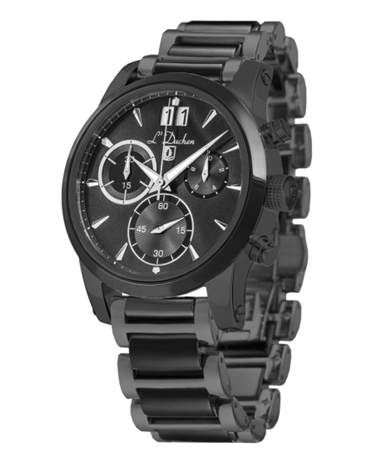 Мужские швейцарские часы-хронографХронографФункция позволяет измерять отрезки времени с особой точностью: часы, минуты, секунды. Верным признаком хронографа является наличие на циферблате 3 дополнительных окошек-счётчиков. L'Duchen Aerostat Chrono D 232.70.31, кварцевый механизм с высокой точностью. Сапфировое стеклоСапфировое стеклоПрочный и надёжный материал из кристалла сапфира синтетического происхождения, характеризующийся особой твёрдостью и устойчивостью к царапинам и повреждениям. устойчивое к появлению царапин, обладающее высокой прозрачностью. Корпус часов выполнен из нержавеющей стали с PVD-покрытиемPVDУльтратонкое покрытие наносится в технике вакуумного напыления, сочетает в себе нитрид титана особой прочности со слоем золота или оксида хрома. Несёт в себе декоративную или защитную функцию.. БезельБезельВнешний ободок, закрепляющий стекло. В спортивных часах так называется поворотное кольцо с делениями на циферблате, выполняет роль таймера – замеряет отрезки времени на шкале. Неподвижный безель – элемент декора. Однонаправленно вращающийся безель на дайверских часах позволяет фиксировать моменты погружения и выныривания на поверхность. из керамики. Стрелки с люминесцентным покрытиемЛюминесцентное покрытиеПозволяет считывать показания времени в темноте. Производители наносят на стрелки, часовые индексы, безель или поверхность циферблата светонакопительный состав, дающий холодное свечение.. Класс водозащиты: 100 метров, позволит плавать, нырять и заниматься другими водными видами спорта. Стальной браслет с PVD-покрытиемPVDУльтратонкое покрытие наносится в технике вакуумного напыления, сочетает в себе нитрид титана особой прочности со слоем золота или оксида хрома. Несёт в себе декоративную или защитную функцию. и керамическими вставками на застёжке «бабочка» с кнопкамиЗастёжка "бабочка"Такой вид застёжки дополняется предохранителями, помогающими избежать случайного раскрытия браслета. Обладают изящным исполнением. .