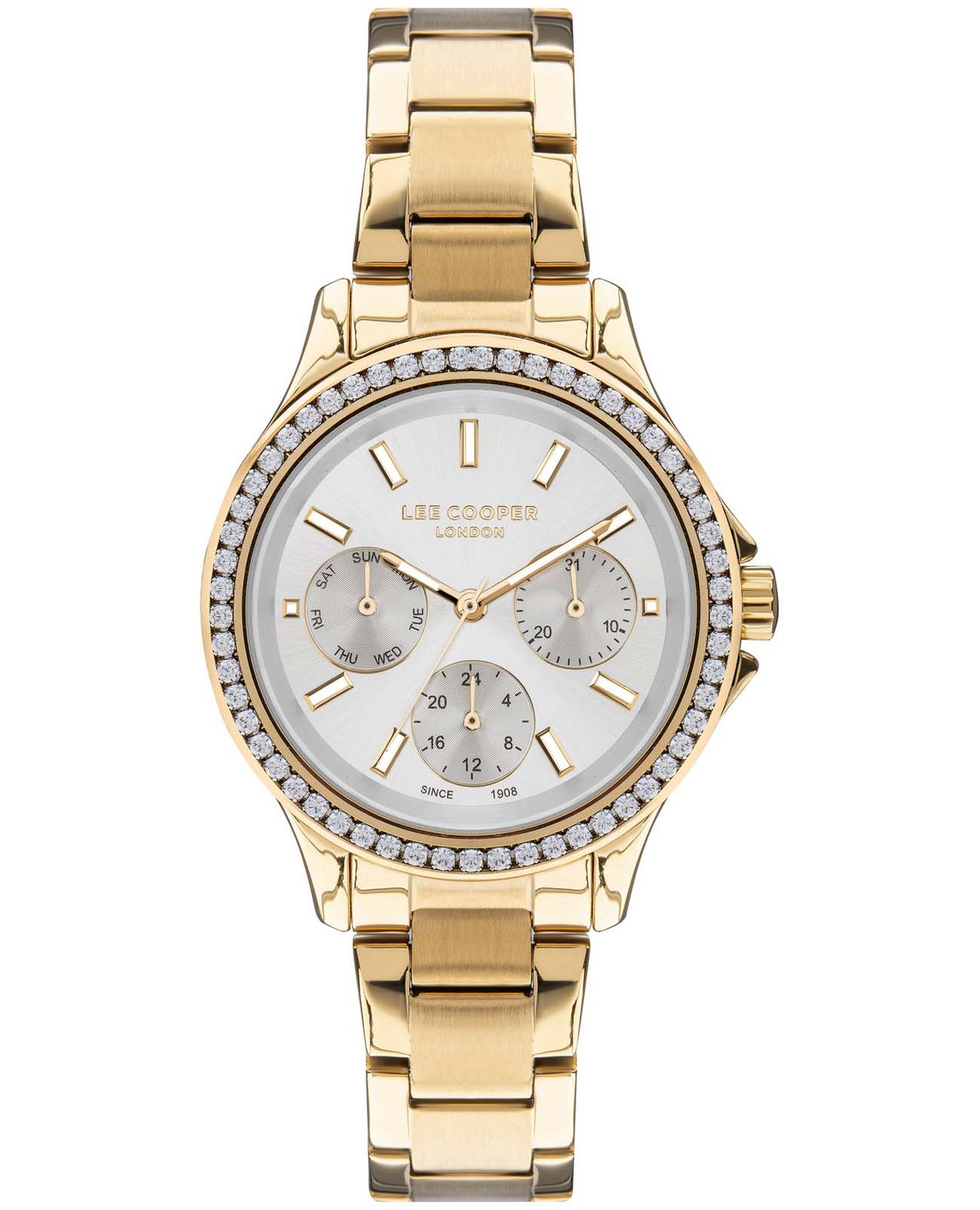 Женские часы Lee Cooper LC07512.130 — это стильное сочетание элегантности и современного дизайна. Круглый корпус диаметром 36 мм выполнен из суперметалла с IP-покрытиемIP-покрытиеМетод ионного напыления. Демонстрирует повышенную устойчивость к истиранию, окислению и химическим веществам. Под воздействием высокого давления и температуры около 1500°C молекулы металла надёжно соединяются с частицами корпуса часов. золотого цвета, а неподвижный безельБезельВнешний ободок, закрепляющий стекло. В спортивных часах так называется поворотное кольцо с делениями на циферблате, выполняет роль таймера – замеряет отрезки времени на шкале. Неподвижный безель – элемент декора. Однонаправленно вращающийся безель на дайверских часах позволяет фиксировать моменты погружения и выныривания на поверхность. украшен цирконами, придающими модели особый блеск. Серебристый циферблат защищен минеральным стекломМинеральное стеклоМинеральное стекло представляет собой искусственно выращенный минерал кварца. Такое стекло отличается особой устойчивостью к повреждениям и царапинам. Уступает по некоторым качествам сапфировому стеклу., обеспечивающим устойчивость к царапинам. Метки в виде штрихов. Часы оснащены надежным кварцевым механизмом, а металлический браслет с IP-покрытиемIP-покрытиеМетод ионного напыления. Демонстрирует повышенную устойчивость к истиранию, окислению и химическим веществам. Под воздействием высокого давления и температуры около 1500°C молекулы металла надёжно соединяются с частицами корпуса часов. на раскладной застёжкеРаскладная застёжкаТакой тип застёжки используется только на браслетах из металла. Она никогда не раскрывается полностью, происходит разделение на 2 и более частей. Раскладывающая застёжка снизит вероятность потери часов к минимуму. гарантирует комфортную посадку на запястье. Мультифункциональная модель с индикацией даты, дня недели, с дополнительным 24-х часовым индикатором. Стрелки и метки с люминесцентным покрытиемЛюминесцентное покрытиеПозволяет считывать показания времени в темноте. Производители наносят на стрелки, часовые индексы, безель или поверхность циферблата светонакопительный состав, дающий холодное свечение. позволяют легко считывать время даже в условиях недостаточного освещения. Водозащита 30 метров защищает модель от случайных брызг и дождя. Lee Cooper  — отличный выбор для тех, кто ценит утонченность и качество.