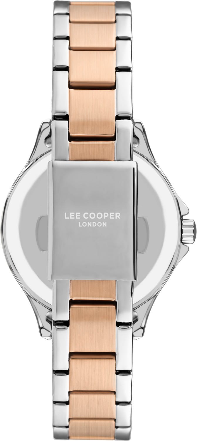 Женские часы Lee Cooper LC07512.530 — это стильное сочетание элегантности и современного дизайна. Круглый корпус диаметром 36 мм выполнен из суперметалла, а неподвижный безельБезельВнешний ободок, закрепляющий стекло. В спортивных часах так называется поворотное кольцо с делениями на циферблате, выполняет роль таймера – замеряет отрезки времени на шкале. Неподвижный безель – элемент декора. Однонаправленно вращающийся безель на дайверских часах позволяет фиксировать моменты погружения и выныривания на поверхность. с IP-покрытиемIP-покрытиеМетод ионного напыления. Демонстрирует повышенную устойчивость к истиранию, окислению и химическим веществам. Под воздействием высокого давления и температуры около 1500°C молекулы металла надёжно соединяются с частицами корпуса часов. цвета розового золота украшен цирконами, придающими модели особый блеск. Серебристый циферблат защищен минеральным стекломМинеральное стеклоМинеральное стекло представляет собой искусственно выращенный минерал кварца. Такое стекло отличается особой устойчивостью к повреждениям и царапинам. Уступает по некоторым качествам сапфировому стеклу., обеспечивающим устойчивость к царапинам. Метки в виде штрихов. Часы оснащены надежным кварцевым механизмом, а металлический браслет с частичным IP-покрытиемIP-покрытиеМетод ионного напыления. Демонстрирует повышенную устойчивость к истиранию, окислению и химическим веществам. Под воздействием высокого давления и температуры около 1500°C молекулы металла надёжно соединяются с частицами корпуса часов. на раскладной застёжкеРаскладная застёжкаТакой тип застёжки используется только на браслетах из металла. Она никогда не раскрывается полностью, происходит разделение на 2 и более частей. Раскладывающая застёжка снизит вероятность потери часов к минимуму. гарантирует комфортную посадку на запястье. Мультифункциональная модель с индикацией даты, дня недели, с дополнительным 24-х часовым индикатором. Стрелки и метки с люминесцентным покрытиемЛюминесцентное покрытиеПозволяет считывать показания времени в темноте. Производители наносят на стрелки, часовые индексы, безель или поверхность циферблата светонакопительный состав, дающий холодное свечение. позволяют легко считывать время даже в условиях недостаточного освещения. Водозащита 30 метров защищает модель от случайных брызг и дождя. Lee Cooper — отличный выбор для тех, кто ценит утонченность и качество.