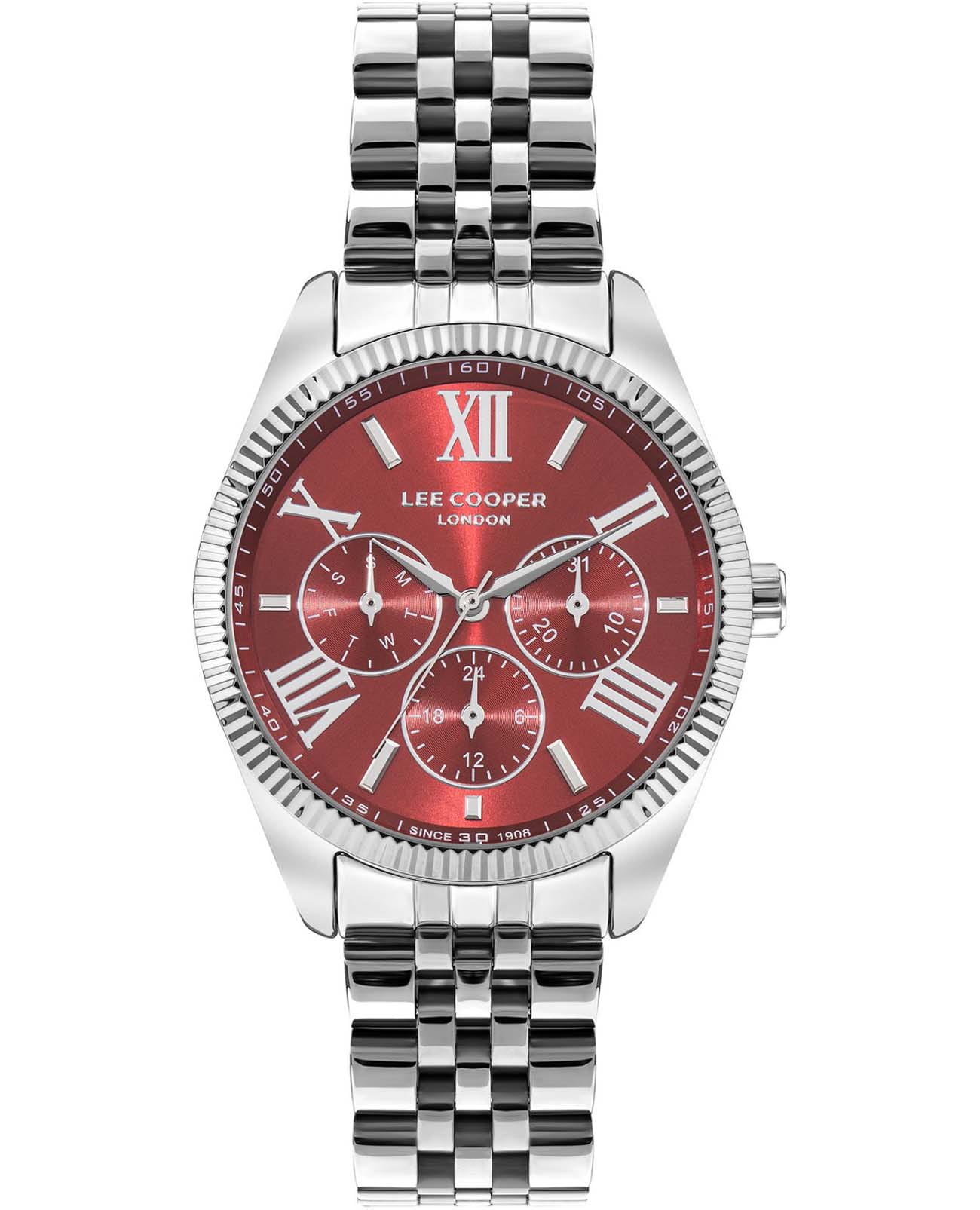Женские часы Lee Cooper LC07811.390 — это стильное сочетание элегантности и современного дизайна. Изысканный корпус диаметром 37 мм выполнен из суперметалла серебристого цвета, придающий модели особый блеск. Циферблат красного цвета защищен минеральным стекломМинеральное стеклоМинеральное стекло представляет собой искусственно выращенный минерал кварца. Такое стекло отличается особой устойчивостью к повреждениям и царапинам. Уступает по некоторым качествам сапфировому стеклу., обеспечивающим устойчивость к царапинам. Метки в виде римских цифр. Вынесенный циферблат с 24-х часовым указателем времени, индикацией даты и дня недели. Часы оснащены надежным кварцевым механизмом, а серебристый стальной браслет на раскладной застёжкеРаскладная застёжкаТакой тип застёжки используется только на браслетах из металла. Она никогда не раскрывается полностью, происходит разделение на 2 и более частей. Раскладывающая застёжка снизит вероятность потери часов к минимуму. гарантирует комфортную посадку на запястье. Водозащита 50 метров защищает модель от случайных брызг и дождя. Lee Cooper  — отличный выбор для тех, кто ценит утонченность и качество.