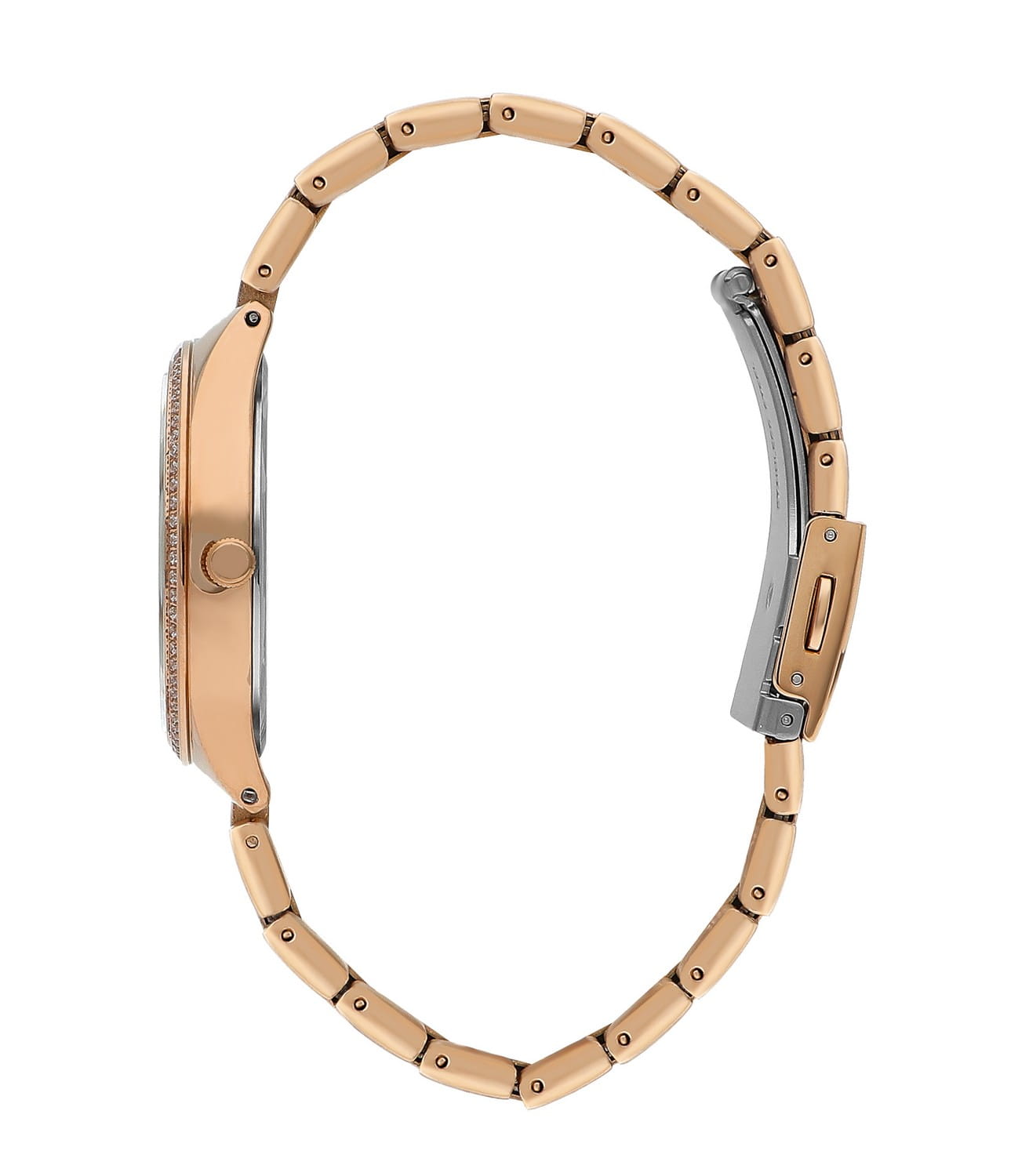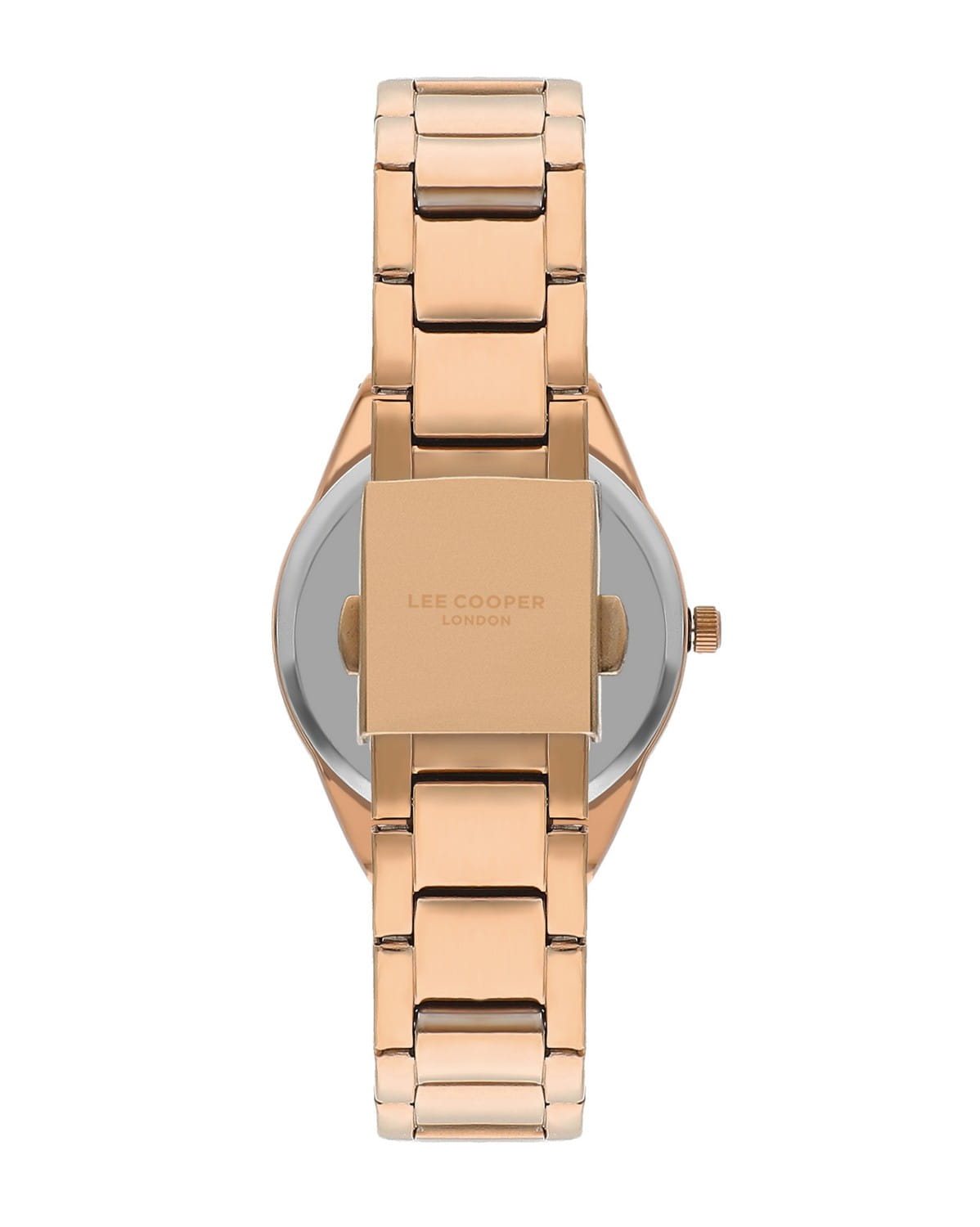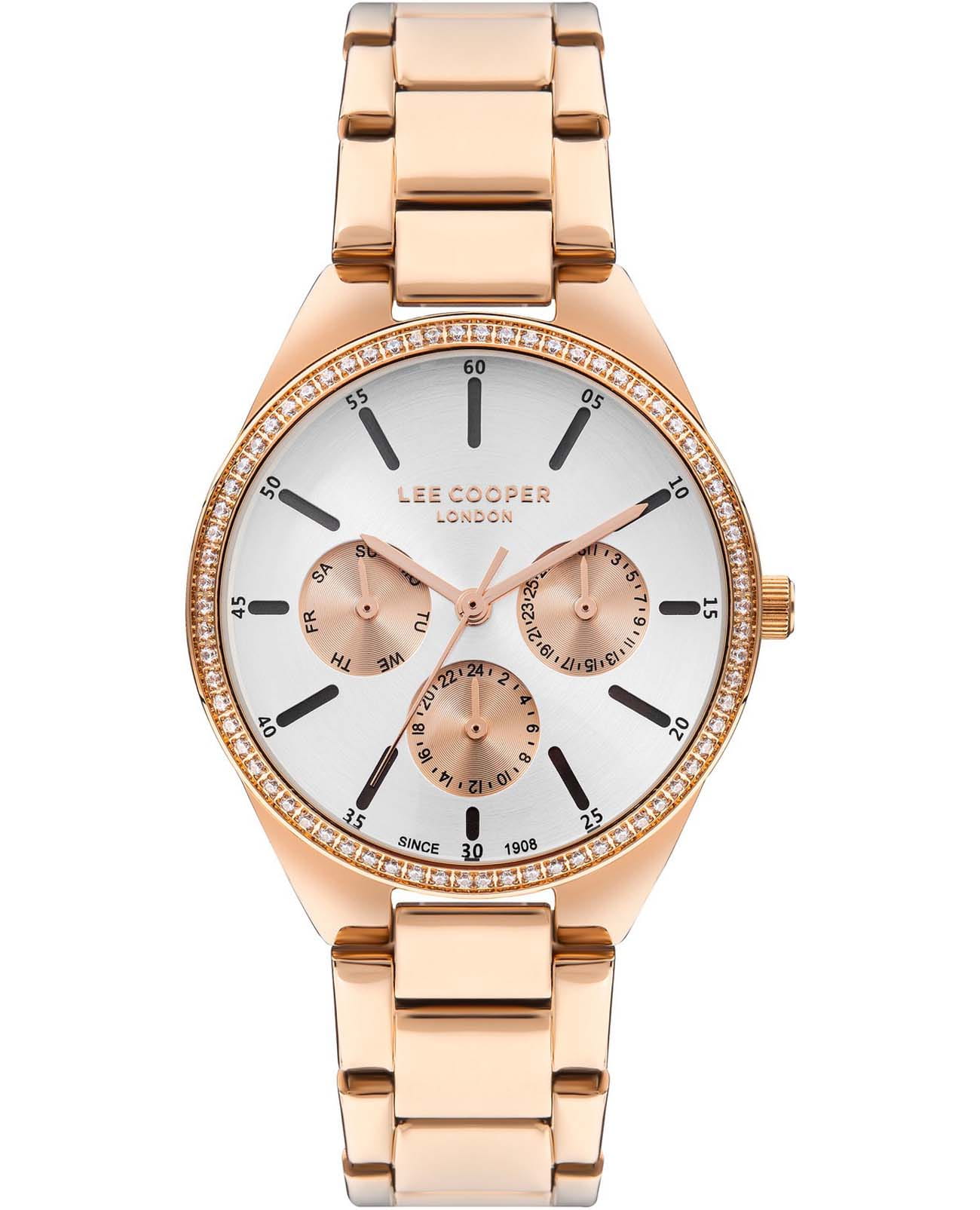 Женские часы Lee Cooper LC07863.430 — это стильное сочетание элегантности и современного дизайна. Круглый корпус диаметром 34 мм выполнен из суперметалла с IP-покрытиемIP-покрытиеМетод ионного напыления. Демонстрирует повышенную устойчивость к истиранию, окислению и химическим веществам. Под воздействием высокого давления и температуры около 1500°C молекулы металла надёжно соединяются с частицами корпуса часов. золотого цвета, а неподвижный безельБезельВнешний ободок, закрепляющий стекло. В спортивных часах так называется поворотное кольцо с делениями на циферблате, выполняет роль таймера – замеряет отрезки времени на шкале. Неподвижный безель – элемент декора. Однонаправленно вращающийся безель на дайверских часах позволяет фиксировать моменты погружения и выныривания на поверхность. украшен цирконами, придающими модели особый блеск. Серебристый циферблат защищен минеральным стекломМинеральное стеклоМинеральное стекло представляет собой искусственно выращенный минерал кварца. Такое стекло отличается особой устойчивостью к повреждениям и царапинам. Уступает по некоторым качествам сапфировому стеклу., обеспечивающим устойчивость к царапинам. Метки в виде штрихов. Часы оснащены надежным кварцевым механизмом, а металлический браслет с IP-покрытиемIP-покрытиеМетод ионного напыления. Демонстрирует повышенную устойчивость к истиранию, окислению и химическим веществам. Под воздействием высокого давления и температуры около 1500°C молекулы металла надёжно соединяются с частицами корпуса часов. на раскладной застёжкеРаскладная застёжкаТакой тип застёжки используется только на браслетах из металла. Она никогда не раскрывается полностью, происходит разделение на 2 и более частей. Раскладывающая застёжка снизит вероятность потери часов к минимуму. гарантирует комфортную посадку на запястье. Мультифункциональная модель с индикацией даты, дня недели, с дополнительным 24-х часовым индикатором. Водозащита 30 метров защищает модель от случайных брызг и дождя. Lee Cooper  — отличный выбор для тех, кто ценит утонченность и качество.