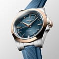 Женские швейцарские механические часы с автоподзаводом Longines Conquest L3.430.5.92.9. Сапфировое стеклоСапфировое стеклоПрочный и надёжный материал из кристалла сапфира синтетического происхождения, характеризующийся особой твёрдостью и устойчивостью к царапинам и повреждениям. устойчивое к появлению царапин, обладающее высокой прозрачностью. Корпус часов изготовлен из нержавеющей стали. Циферблат выполнен по технологии Sunray (солнечные лучи). Стрелки с люминесцентным покрытиемЛюминесцентное покрытиеПозволяет считывать показания времени в темноте. Производители наносят на стрелки, часовые индексы, безель или поверхность циферблата светонакопительный состав, дающий холодное свечение.. Окошко даты в положении 6 часов. Прозрачная задняя крышка. Класс водозащиты: 100 метров, позволит плавать, нырять и заниматься другими водными видами спорта. Каучуковый браслет на раскладной застёжкеРаскладная застёжкаТакой тип застёжки используется только на браслетах из металла. Она никогда не раскрывается полностью, происходит разделение на 2 и более частей. Раскладывающая застёжка снизит вероятность потери часов к минимуму.. БезельБезельВнешний ободок, закрепляющий стекло. В спортивных часах так называется поворотное кольцо с делениями на циферблате, выполняет роль таймера – замеряет отрезки времени на шкале. Неподвижный безель – элемент декора. Однонаправленно вращающийся безель на дайверских часах позволяет фиксировать моменты погружения и выныривания на поверхность. из стали с 18-каратным золотом18-каратное золотоОбозначение по каратной системе пробирования, оно показывает, сколько драгоценного металла содержится в изделии. 18 карат - в составе 75% чистого золота, соответствует 750 пробе.