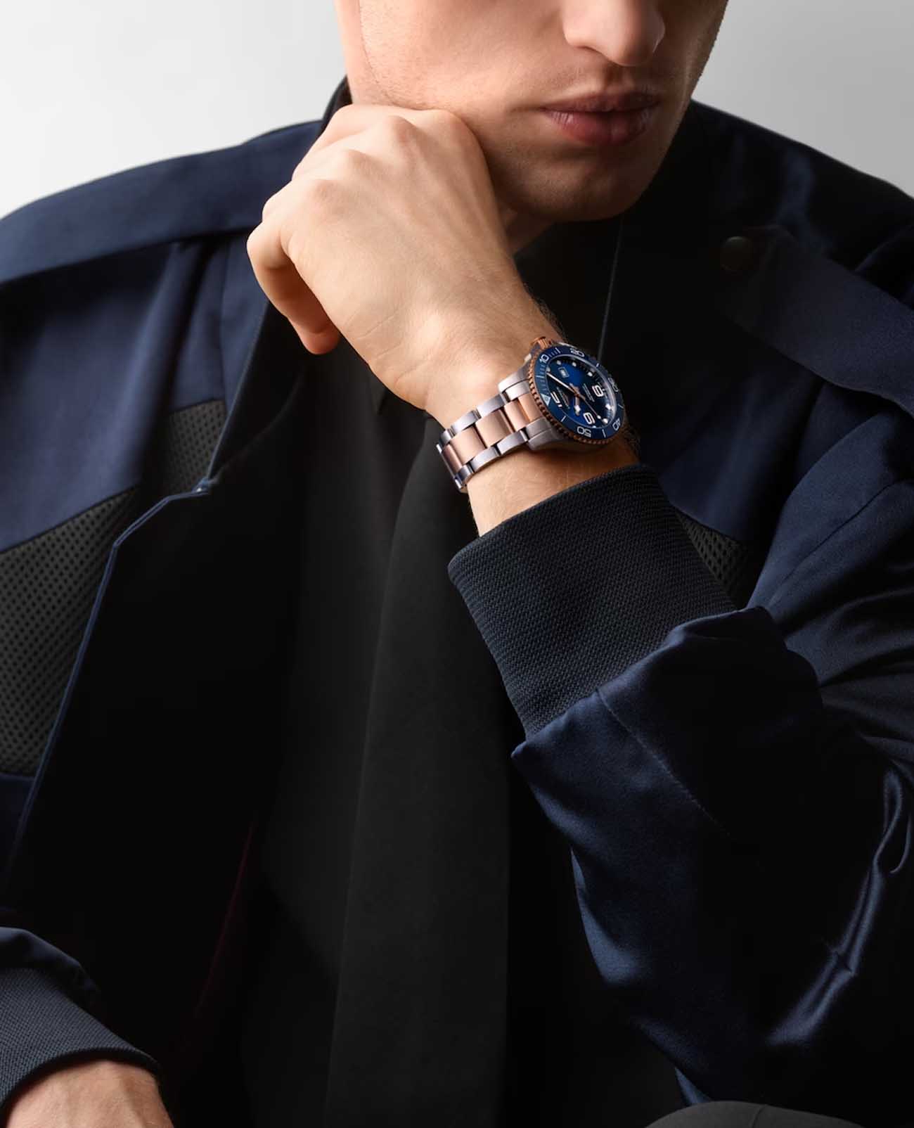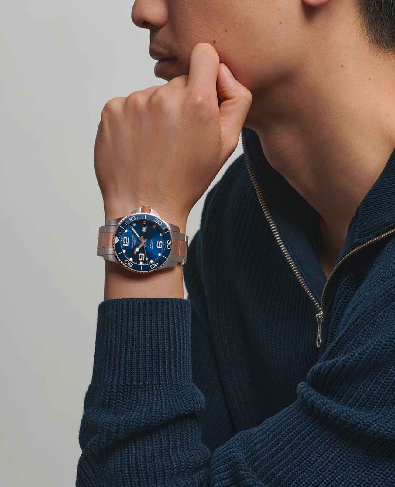 Швейцарские механические часы для дайвинга Longines HydroConquest L3.782.3.98.7. Сапфировое стеклоСапфировое стеклоПрочный и надёжный материал из кристалла сапфира синтетического происхождения, характеризующийся особой твёрдостью и устойчивостью к царапинам и повреждениям. с многослойным антибликовым покрытием с обеих сторон, устойчивое к появлению царапин, обладающее высокой прозрачностью. Корпус часов изготовлен из стали. Вращающийся безельБезельВнешний ободок, закрепляющий стекло. В спортивных часах так называется поворотное кольцо с делениями на циферблате, выполняет роль таймера – замеряет отрезки времени на шкале. Неподвижный безель – элемент декора. Однонаправленно вращающийся безель на дайверских часах позволяет фиксировать моменты погружения и выныривания на поверхность. из стали с PVD-покрытиемPVDУльтратонкое покрытие наносится в технике вакуумного напыления, сочетает в себе нитрид титана особой прочности со слоем золота или оксида хрома. Несёт в себе декоративную или защитную функцию. и керамики, защищенный от царапин, никогда не изнашивается и не выцветает. Стрелки и метки с люминесцентным покрытиемЛюминесцентное покрытиеПозволяет считывать показания времени в темноте. Производители наносят на стрелки, часовые индексы, безель или поверхность циферблата светонакопительный состав, дающий холодное свечение.. Окошко даты находится в положении 3 часов. Класс водозащиты: 300 метров, позволит плавать, нырять и заниматься другими водными видами спорта. Стальной браслет с частичным PVD-покрытиемPVDУльтратонкое покрытие наносится в технике вакуумного напыления, сочетает в себе нитрид титана особой прочности со слоем золота или оксида хрома. Несёт в себе декоративную или защитную функцию. на раскладной застёжкеРаскладная застёжкаТакой тип застёжки используется только на браслетах из металла. Она никогда не раскрывается полностью, происходит разделение на 2 и более частей. Раскладывающая застёжка снизит вероятность потери часов к минимуму..