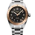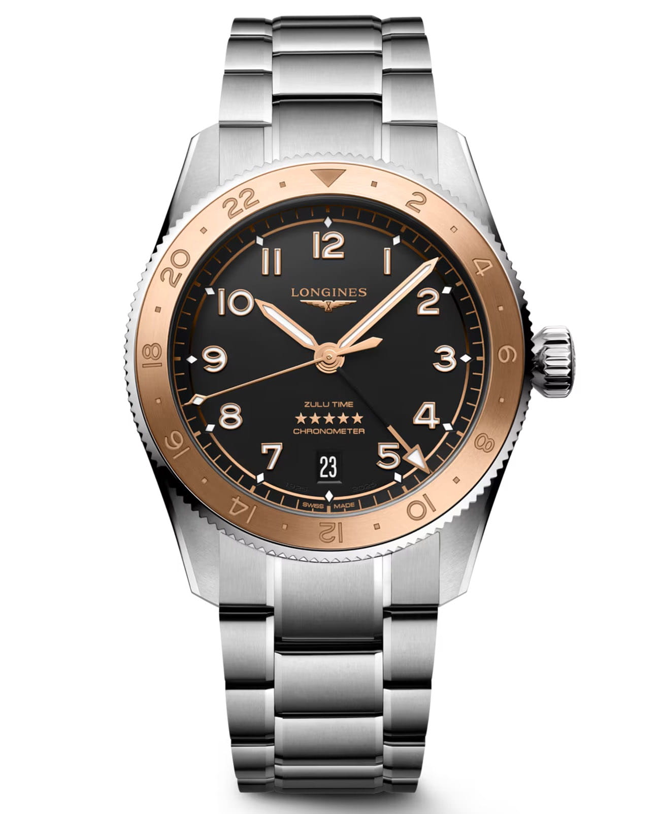 Часы Longines Spirit Zulu Time 1925 L3.803.5.53.6 выполнены в классическом круглом корпусе диаметром 39 мм из нержавеющей стали, 18-каратного розового золота и оснащены двунаправленным вращающимся безелем. Модель укомплектована автоматическим механизмом калибра L844.4, обеспечивающим запас хода до 72 часов. Механизм имеет сертификат хронометра и оснащён балансовой пружиной из монокристаллического кремния, устойчивой к магнитным полям и перепадам температур. Также реализована функция второго часового поясаВторой часовой поясФункция, позволяющая отображать время двух часовых поясов одновременно. и отображение даты. Циферблат матового чёрного цвета дополнен арабскими цифрами с покрытием Swiss Super-LumiNova®Люминесцентное покрытиеПозволяет считывать показания времени в темноте. Производители наносят на стрелки, часовые индексы, безель или поверхность циферблата светонакопительный состав, дающий холодное свечение., что обеспечивает отличную читаемость даже в темноте. Стрелки окрашены в розовый цвет для лучшей контрастности. Защиту циферблата обеспечивает сапфировое стеклоСапфировое стеклоПрочный и надёжный материал из кристалла сапфира синтетического происхождения, характеризующийся особой твёрдостью и устойчивостью к царапинам и повреждениям. с многослойным антибликовым покрытиемАнтибликовое покрытиеСлой оксида металла в 0,13-0,3 микрон, благодаря которому стекло часов не бликует и не отражает свет. Антибликовое покрытие уменьшает отражение света в 10 раз, обеспечивая отличную читаемость показателей циферблата. с обеих сторон. Задняя крышка — прозрачная, выполненная из сапфирового стекла, что позволяет наблюдать за работой механизма. Водозащита позволяет использовать часы в повседневных условиях, включая плавание. Диаметр корпуса — 39 мм, между лугами — 21 мм, толщина — 13.5 мм, общая длина от луга до луга — 46.8 мм. Вес модели — около 158 грамм. Часы установлены на стальной браслет с системой быстрой смены ремешка и оснащены надёжной раскладной застёжкой с кнопками. Это сочетание высокой технологии, точности и элегантности для ценителей премиального качества и исторического наследия.