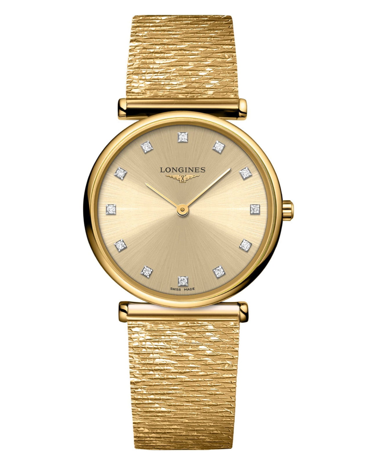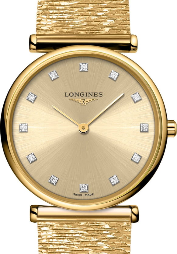 Женские швейцарские часы Longines La Grande Classique L4.512.2.33.8, кварцевый механизм с высокой точностью. Сапфировое стеклоСапфировое стеклоПрочный и надёжный материал из кристалла сапфира синтетического происхождения, характеризующийся особой твёрдостью и устойчивостью к царапинам и повреждениям. устойчивое к появлению царапин, обладающее высокой прозрачностью. Корпус часов изготовлен из стали с PVD-покрытиемPVDУльтратонкое покрытие наносится в технике вакуумного напыления, сочетает в себе нитрид титана особой прочности со слоем золота или оксида хрома. Несёт в себе декоративную или защитную функцию.. Циферблат дополнен 12 бриллиантами. Класс водозащиты: 30 метров, позволит защитить корпус от случайных брызг или капель дождя. Браслет из стали с PVD-покрытиемPVDУльтратонкое покрытие наносится в технике вакуумного напыления, сочетает в себе нитрид титана особой прочности со слоем золота или оксида хрома. Несёт в себе декоративную или защитную функцию. на раскладной застёжкеРаскладная застёжкаТакой тип застёжки используется только на браслетах из металла. Она никогда не раскрывается полностью, происходит разделение на 2 и более частей. Раскладывающая застёжка снизит вероятность потери часов к минимуму..