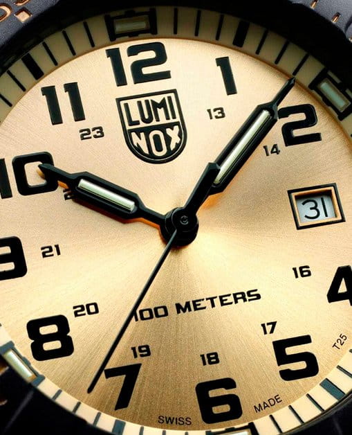 Мужские наручные часы Luminox XS.0325.GP из коллекции Leatherback SEA Turtle Giant сочетают в себе спортивный дизайн и надежность швейцарского качества. Модель обладает круглым корпусом диаметром 44 мм, изготовленным из карбонаКарбонОт «carbon», «carbone» - углерод, углепластик - полимерный композиционный материал из переплетённых под определенным углом между собой нитей углеродного волокна, применяется для изготовления лёгких, но прочных деталей. В часах часто используют для украшения циферблатов и ремешков. Так же карбон используется в изготовлении корпусов. Такие корпуса обладают антикоррозионным свойством, не поддаются электромагнитному излучению, обладают повышенной прочностью и противоударностью. (CARBONOX™), что обеспечивает высокую устойчивость к внешним воздействиям при сохранении легкости. Циферблат золотистого цвета украшен контрастными черными метками и стрелками с , гарантирующим постоянную видимость времени даже в условиях низкой освещенности. Часы оснащены кварцевым механизмом швейцарского производства, обеспечивающим точность хода ±15 секунд в месяц. Защиту циферблата обеспечивает прочное минеральное стеклоМинеральное стеклоМинеральное стекло представляет собой искусственно выращенный минерал кварца. Такое стекло отличается особой устойчивостью к повреждениям и царапинам. Уступает по некоторым качествам сапфировому стеклу., устойчивое к царапинам и механическим повреждениям. Водонепроницаемость модели достигает 10 атмосфер (100 метров), что делает их подходящими для плавания и активного отдыха на воде. Модель также оснащена безелемБезельВнешний ободок, закрепляющий стекло. В спортивных часах так называется поворотное кольцо с делениями на циферблате, выполняет роль таймера – замеряет отрезки времени на шкале. Неподвижный безель – элемент декора. Однонаправленно вращающийся безель на дайверских часах позволяет фиксировать моменты погружения и выныривания на поверхность. с односторонним вращением, что добавляет функциональности при использовании в водных условиях. Ремешок выполнен из полиуретана (PU) с нержавеющей стальной застежкой, что обеспечивает комфортное ношение в течение дня. Дополнительно часы имеют окно даты в положении «3 часа», что делает их практичными для повседневного использования.