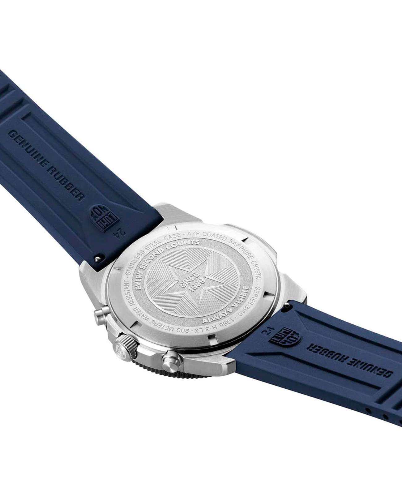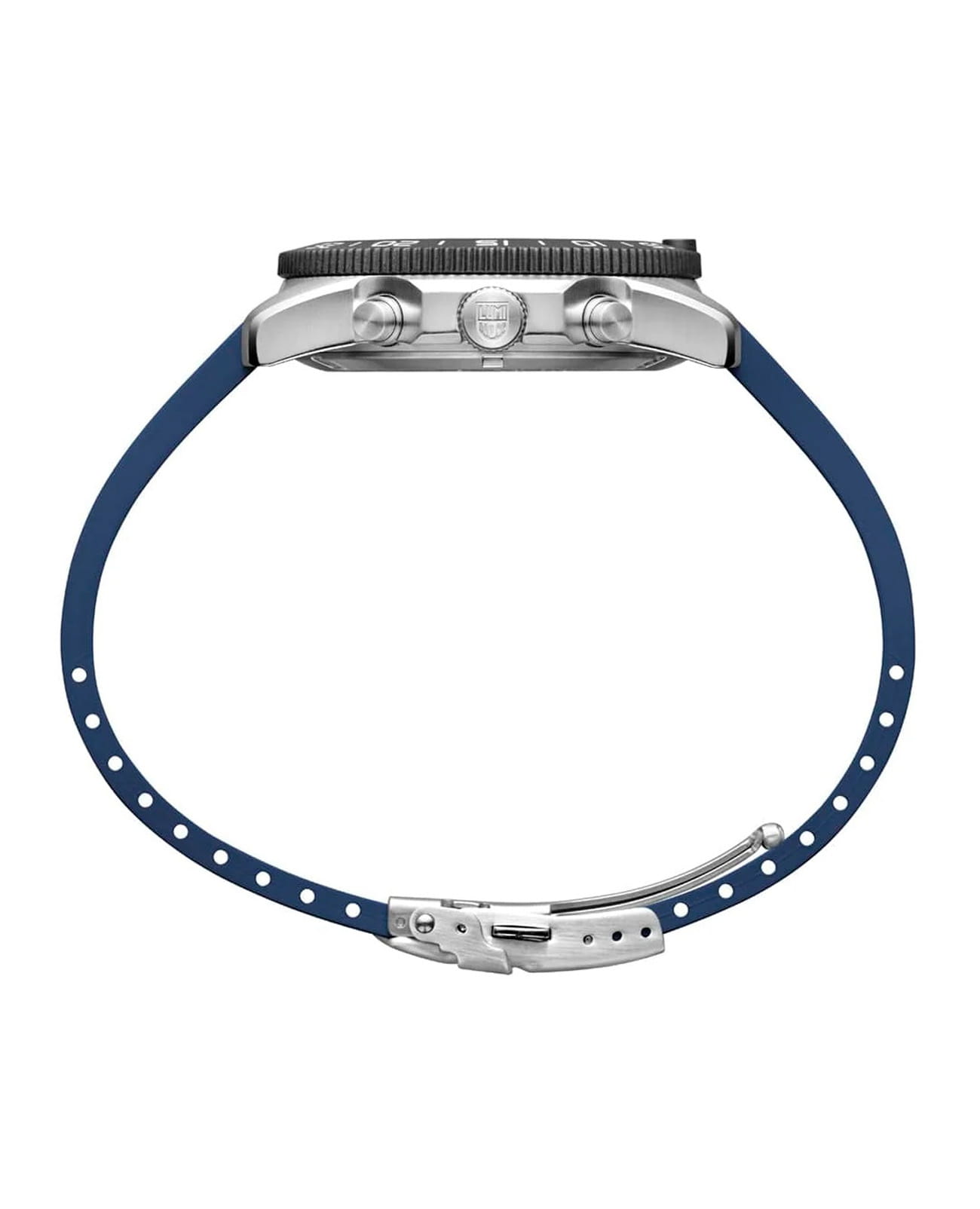 Мужские наручные часы-хронографХронографФункция позволяет измерять отрезки времени с особой точностью: часы, минуты, секунды. Верным признаком хронографа является наличие на циферблате 3 дополнительных окошек-счётчиков. Luminox XS.3143.SET из коллекции Pacific Diver сочетают в себе спортивный дизайн и надежность швейцарского качества . Модель обладает круглым корпусом диаметром 44 мм, изготовленным из нержавеющей стали, что обеспечивает высокую устойчивость к внешним воздействиям и долговечность . Циферблат черного цвета украшен контрастными метками и стрелками с люминесцентным покрытиемЛюминесцентное покрытиеПозволяет считывать показания времени в темноте. Производители наносят на стрелки, часовые индексы, безель или поверхность циферблата светонакопительный состав, дающий холодное свечение., гарантирующим постоянную видимость времени даже в условиях низкой освещенности благодаря системе LLTLLTLLT — это автономный механизм подсветки, основанный на использовании микроскопических газонаполненных элементов. Специальные герметичные капсулы из боросиликатного стекла, интегрированные в циферблат, генерируют свечение без необходимости подключения к внешним источникам энергии. Для их работы не требуется ни дополнительный свет, ни механическое воздействие (например, нажатие кнопки). Свечение возникает благодаря химическому процессу: реакция между тритием, заключенным в капсулах, и люминофорным покрытием создает стабильное автономное освещение. Технология обеспечивает энергетическую независимость и долговечность подсветки. (микрогазовые огни) . Часы оснащены кварцевым механизмом швейцарского производства Ronda 515, обеспечивающим точность хода ±15 секунд в месяц . Защиту циферблата обеспечивает прочное сапфировое стеклоСапфировое стеклоПрочный и надёжный материал из кристалла сапфира синтетического происхождения, характеризующийся особой твёрдостью и устойчивостью к царапинам и повреждениям. с антибликовым покрытиемАнтибликовое покрытиеСлой оксида металла в 0,13-0,3 микрон, благодаря которому стекло часов не бликует и не отражает свет. Антибликовое покрытие уменьшает отражение света в 10 раз, обеспечивая отличную читаемость показателей циферблата., устойчивое к царапинам и механическим повреждениям . Водонепроницаемость модели достигает 20 атмосфер (200 метров), что делает их подходящими для плавания и активного отдыха на воде, включая дайвинг . Модель также оснащена безелемБезельВнешний ободок, закрепляющий стекло. В спортивных часах так называется поворотное кольцо с делениями на циферблате, выполняет роль таймера – замеряет отрезки времени на шкале. Неподвижный безель – элемент декора. Однонаправленно вращающийся безель на дайверских часах позволяет фиксировать моменты погружения и выныривания на поверхность. с односторонним вращением, что добавляет функциональности при использовании в водных условиях . Ремешок выполнен из каучука, что обеспечивает комфортное ношение в течение дня и удобство в уходе . Дополнительно часы имеют окно даты в положении «3 часа», что делает их практичными для повседневного использования . Сочетание современных технологий, надежности и стильного дизайна делает Luminox XS.3143.SET идеальным выбором для ценителей качественных аксессуаров. В комплекте идет дополнительный черный каучуковый р