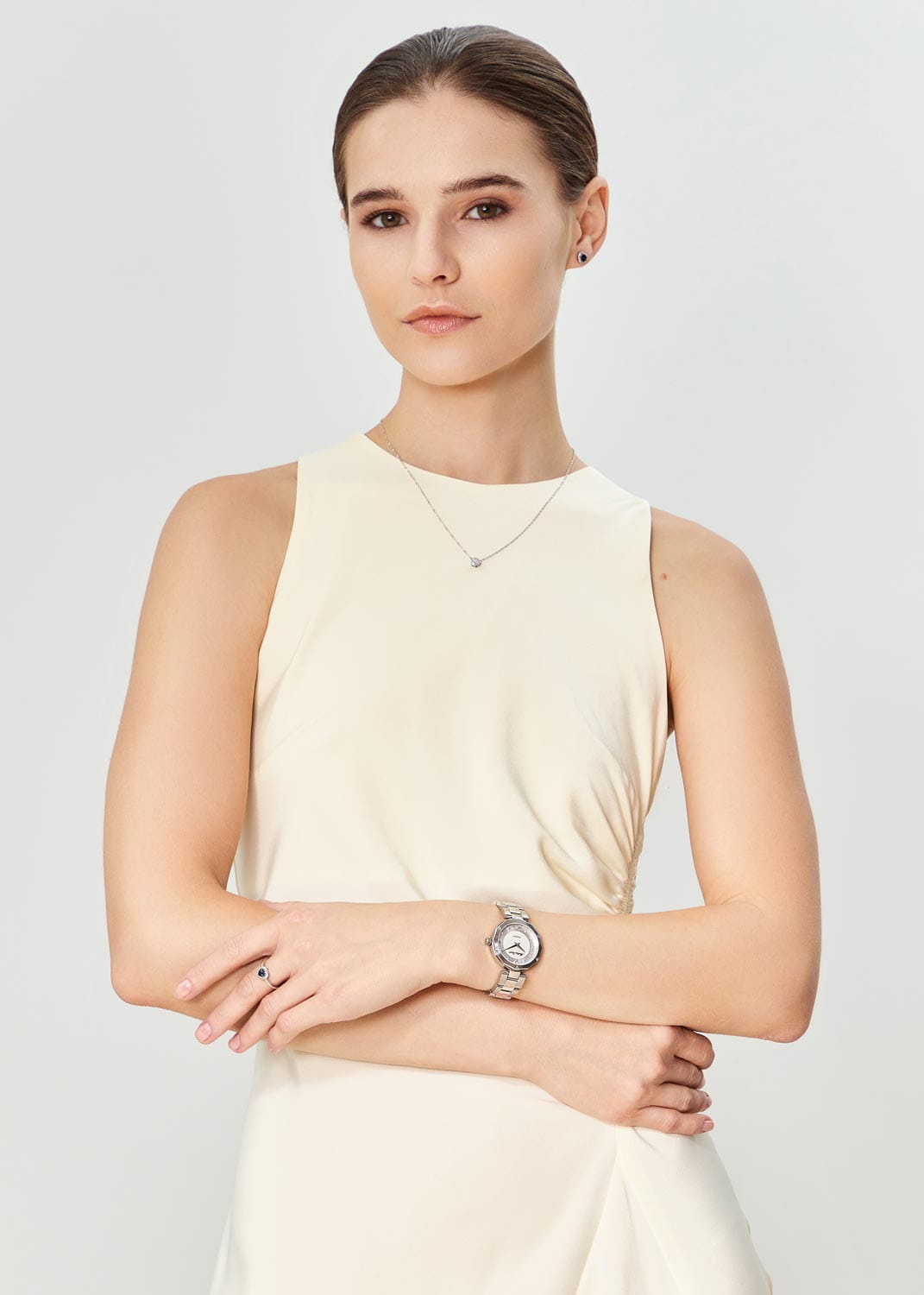 Женские кварцевые часы Mathey-Tissot Molly D1087AQI — это стильное сочетание элегантности и современного дизайна. Изящный корпус выполнен из нержавеющей стали серебристого цвета, диаметром 32 мм, что придаст образу элегантности и надежности. БезельБезельВнешний ободок, закрепляющий стекло. В спортивных часах так называется поворотное кольцо с делениями на циферблате, выполняет роль таймера – замеряет отрезки времени на шкале. Неподвижный безель – элемент декора. Однонаправленно вращающийся безель на дайверских часах позволяет фиксировать моменты погружения и выныривания на поверхность. и циферблат украшены кристаллами. Изысканный циферблат с метками в виде точек придает модели особый блеск. Циферблат защищен минеральным стекломМинеральное стеклоМинеральное стекло представляет собой искусственно выращенный минерал кварца. Такое стекло отличается особой устойчивостью к повреждениям и царапинам. Уступает по некоторым качествам сапфировому стеклу. с сапфировым покрытием, обеспечивает устойчивость к царапинам. Часы оснащены надежным кварцевым механизмом. Стальной браслет на застёжке-бабочке с кнопкамиЗастёжка "бабочка"Такой вид застёжки дополняется предохранителями, помогающими избежать случайного раскрытия браслета. Обладают изящным исполнением. , гарантирует комфортное и безопасное ношение. Класс водозащиты: 50 метров позволит защитить корпус от случайных брызг или капель дождя. Mathey-Tissot — отличный выбор для тех, кто ценит утонченность и качество.