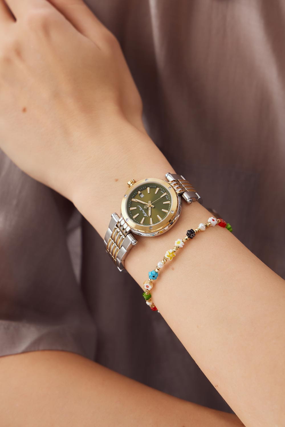 Женские кварцевые часы Mathey-Tissot Neptune D912BV — это стильное сочетание элегантности и современного дизайна. Изящный корпус выполнен из нержавеющей стали, диаметром 32 мм, что придаст образу женственности и романтизма. Изысканный циферблат с метками в виде штрихов придает модели особый блеск. Циферблат защищен минеральным стекломМинеральное стеклоМинеральное стекло представляет собой искусственно выращенный минерал кварца. Такое стекло отличается особой устойчивостью к повреждениям и царапинам. Уступает по некоторым качествам сапфировому стеклу. с сапфировым покрытием, обеспечивает устойчивость к царапинам. Стрелки и метки с люминесцентным покрытиемЛюминесцентное покрытиеПозволяет считывать показания времени в темноте. Производители наносят на стрелки, часовые индексы, безель или поверхность циферблата светонакопительный состав, дающий холодное свечение.. БезельБезельВнешний ободок, закрепляющий стекло. В спортивных часах так называется поворотное кольцо с делениями на циферблате, выполняет роль таймера – замеряет отрезки времени на шкале. Неподвижный безель – элемент декора. Однонаправленно вращающийся безель на дайверских часах позволяет фиксировать моменты погружения и выныривания на поверхность. с PVD-покрытиемPVDУльтратонкое покрытие наносится в технике вакуумного напыления, сочетает в себе нитрид титана особой прочности со слоем золота или оксида хрома. Несёт в себе декоративную или защитную функцию. золотистого цвета. Окошко даты находится в положении 3 часа. Часы оснащены надежным кварцевым механизмом. Стальной браслет с частичным PVD-покрытиемPVDУльтратонкое покрытие наносится в технике вакуумного напыления, сочетает в себе нитрид титана особой прочности со слоем золота или оксида хрома. Несёт в себе декоративную или защитную функцию. на застёжке-бабочке с кнопкамиЗастёжка "бабочка"Такой вид застёжки дополняется предохранителями, помогающими избежать случайного раскрытия браслета. Обладают изящным исполнением. , гарантирует комфортное и безопасное ношение. Класс водозащиты: 50 метров позволит защитить корпус от случайных брызг или капель дождя. Mathey-Tissot  — отличный выбор для тех, кто ценит утонченность и качество.
