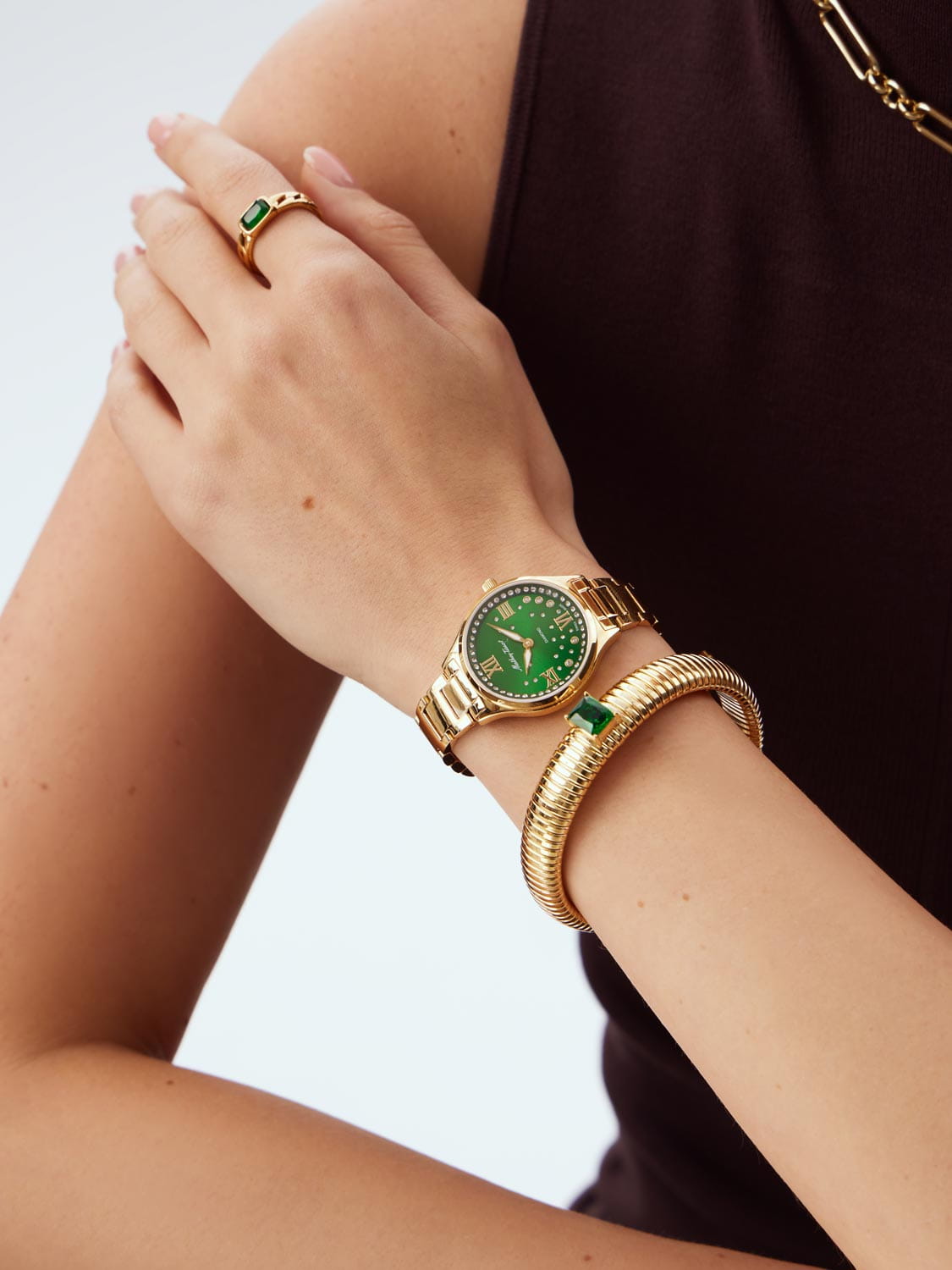Женские кварцевые часы Mathey-Tissot Nicole D985SPYV — это стильное сочетание элегантности и современного дизайна. Изящный корпус выполнен из нержавеющей стали с PVD-покрытиемPVDУльтратонкое покрытие наносится в технике вакуумного напыления, сочетает в себе нитрид титана особой прочности со слоем золота или оксида хрома. Несёт в себе декоративную или защитную функцию. золотистого цвета, диаметром 32 мм, прекрасно впишется в ваш исключительный стиль. Изысканный циферблат с метками в виде римских цифр придает модели особый блеск и защищен сапфировым стекломСапфировое стеклоПрочный и надёжный материал из кристалла сапфира синтетического происхождения, характеризующийся особой твёрдостью и устойчивостью к царапинам и повреждениям., обеспечивающим устойчивость к царапинам. Циферблат украшен кристаллами. Мечевидные стрелки в стиле Dauphine. Часы оснащены надежным кварцевым механизмом. Рифленая заводная головка. Стальной браслет с PVD-покрытиемPVDУльтратонкое покрытие наносится в технике вакуумного напыления, сочетает в себе нитрид титана особой прочности со слоем золота или оксида хрома. Несёт в себе декоративную или защитную функцию. на застёжке-бабочке с кнопкамиЗастёжка "бабочка"Такой вид застёжки дополняется предохранителями, помогающими избежать случайного раскрытия браслета. Обладают изящным исполнением. гарантирует комфортное и безопасное ношение. Класс водозащиты: 50 метров позволит защитить корпус от случайных брызг или капель дождя. Mathey-Tissot  — отличный выбор для тех, кто ценит утонченность и качество.
