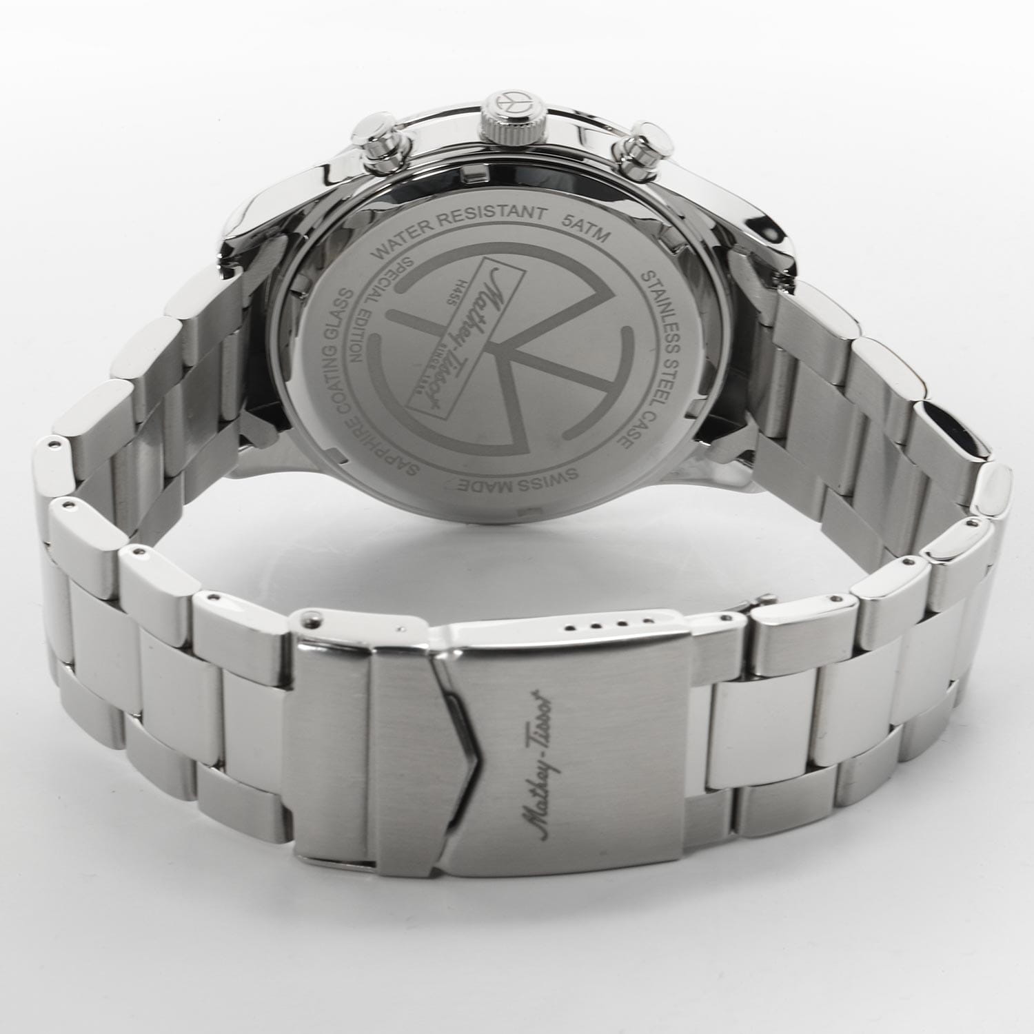Мужские кварцевые часы-хронографХронографФункция позволяет измерять отрезки времени с особой точностью: часы, минуты, секунды. Верным признаком хронографа является наличие на циферблате 3 дополнительных окошек-счётчиков. с секундомеромСекундомерСекундоме́р — прибор, способный измерять интервалы времени с точностью до долей секунды. Mathey-Tissot Mathy H455CHVE — это стильное сочетание элегантности и современного дизайна. Изящный корпус выполнен из нержавеющей стали, диаметром 44 мм, что придаст образу элегантности и надежности. Изысканный циферблат с метками в виде штрихов придает модели особый блеск. Циферблат защищен минеральным стекломМинеральное стеклоМинеральное стекло представляет собой искусственно выращенный минерал кварца. Такое стекло отличается особой устойчивостью к повреждениям и царапинам. Уступает по некоторым качествам сапфировому стеклу. с сапфировым покрытием, обеспечивает устойчивость к царапинам. Стрелки и метки с люминесцентным покрытиемЛюминесцентное покрытиеПозволяет считывать показания времени в темноте. Производители наносят на стрелки, часовые индексы, безель или поверхность циферблата светонакопительный состав, дающий холодное свечение.. Окошко даты находится в положении 4 часа. Стальной браслет на раскладной застёжке с фиксаторомРаскладная застёжкаТакой тип застёжки используется только на браслетах из металла. Она никогда не раскрывается полностью, происходит разделение на 2 и более частей. Раскладывающая застёжка снизит вероятность потери часов к минимуму., гарантирует комфортное и безопасное ношение. Рифленая заводная головка. Класс водозащиты: 50 метров позволит защитить корпус от случайных брызг или капель дождя. Mathey-Tissot — отличный выбор для тех, кто ценит утонченность и качество.