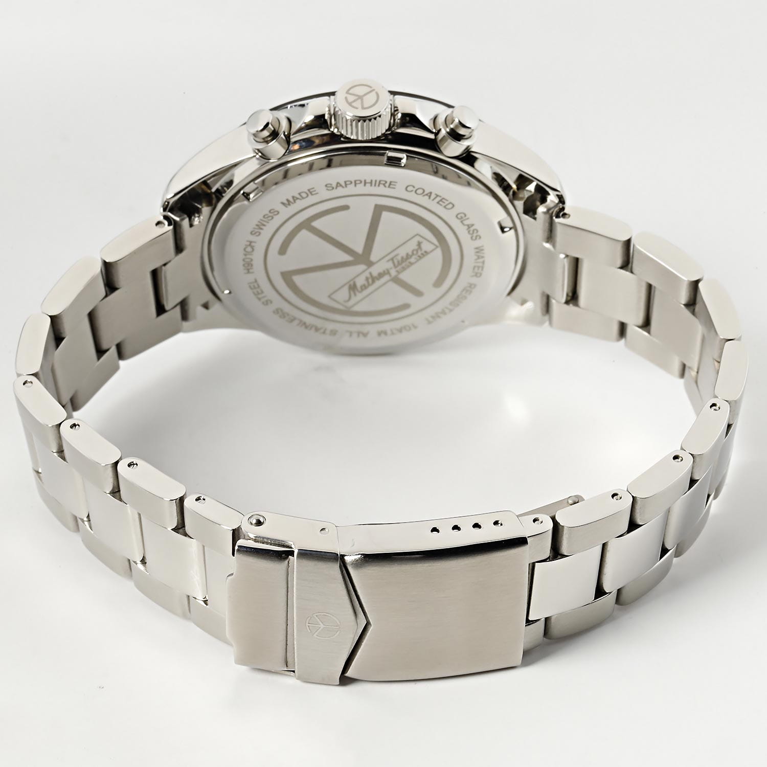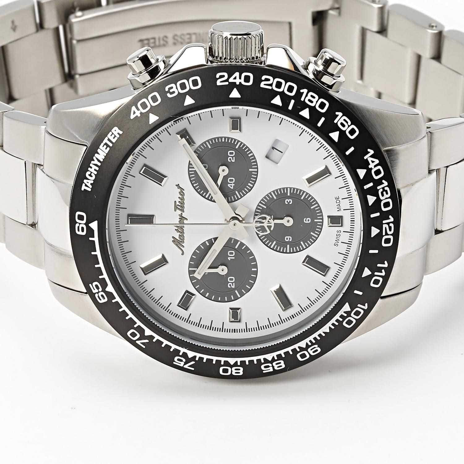 Мужские кварцевые часы-хронографХронографФункция позволяет измерять отрезки времени с особой точностью: часы, минуты, секунды. Верным признаком хронографа является наличие на циферблате 3 дополнительных окошек-счётчиков. Mathey-Tissot Mathy H9010CHAI — это стильное сочетание элегантности и современного дизайна. Изящный корпус выполнен из нержавеющей стали, диаметром 42 мм, что придаст образу элегантности и надежности. Изысканный циферблат с метками в виде штрихов придает модели особый блеск. Циферблат защищен минеральным стекломМинеральное стеклоМинеральное стекло представляет собой искусственно выращенный минерал кварца. Такое стекло отличается особой устойчивостью к повреждениям и царапинам. Уступает по некоторым качествам сапфировому стеклу. с сапфировым покрытием, обеспечивает устойчивость к царапинам. Стрелки и метки с люминесцентным покрытиемЛюминесцентное покрытиеПозволяет считывать показания времени в темноте. Производители наносят на стрелки, часовые индексы, безель или поверхность циферблата светонакопительный состав, дающий холодное свечение.. Шкала тахиметраТахиметрРазмеченная шкала, располагается на ободке или безеле часов. Тахиметр позволяет рассчитать скорость на определённом участке пути, расстояние измеряется в километрах или милях. на безелеБезельВнешний ободок, закрепляющий стекло. В спортивных часах так называется поворотное кольцо с делениями на циферблате, выполняет роль таймера – замеряет отрезки времени на шкале. Неподвижный безель – элемент декора. Однонаправленно вращающийся безель на дайверских часах позволяет фиксировать моменты погружения и выныривания на поверхность. с PVD-покрытиемPVDУльтратонкое покрытие наносится в технике вакуумного напыления, сочетает в себе нитрид титана особой прочности со слоем золота или оксида хрома. Несёт в себе декоративную или защитную функцию.. Окошко даты находится в положении 4 часа. Стальной браслет на раскладной застёжке с фиксаторомРаскладная застёжкаТакой тип застёжки используется только на браслетах из металла. Она никогда не раскрывается полностью, происходит разделение на 2 и более частей. Раскладывающая застёжка снизит вероятность потери часов к минимуму., гарантирует комфортное и безопасное ношение. Рифленая заводная головка. Класс водозащиты: 100 метров позволит плавать, нырять и заниматься другими водными видами спорта. Mathey-Tissot — отличный выбор для тех, кто ценит утонченность и качество.