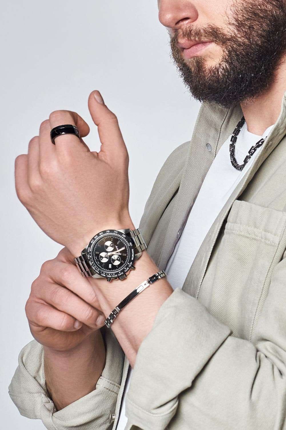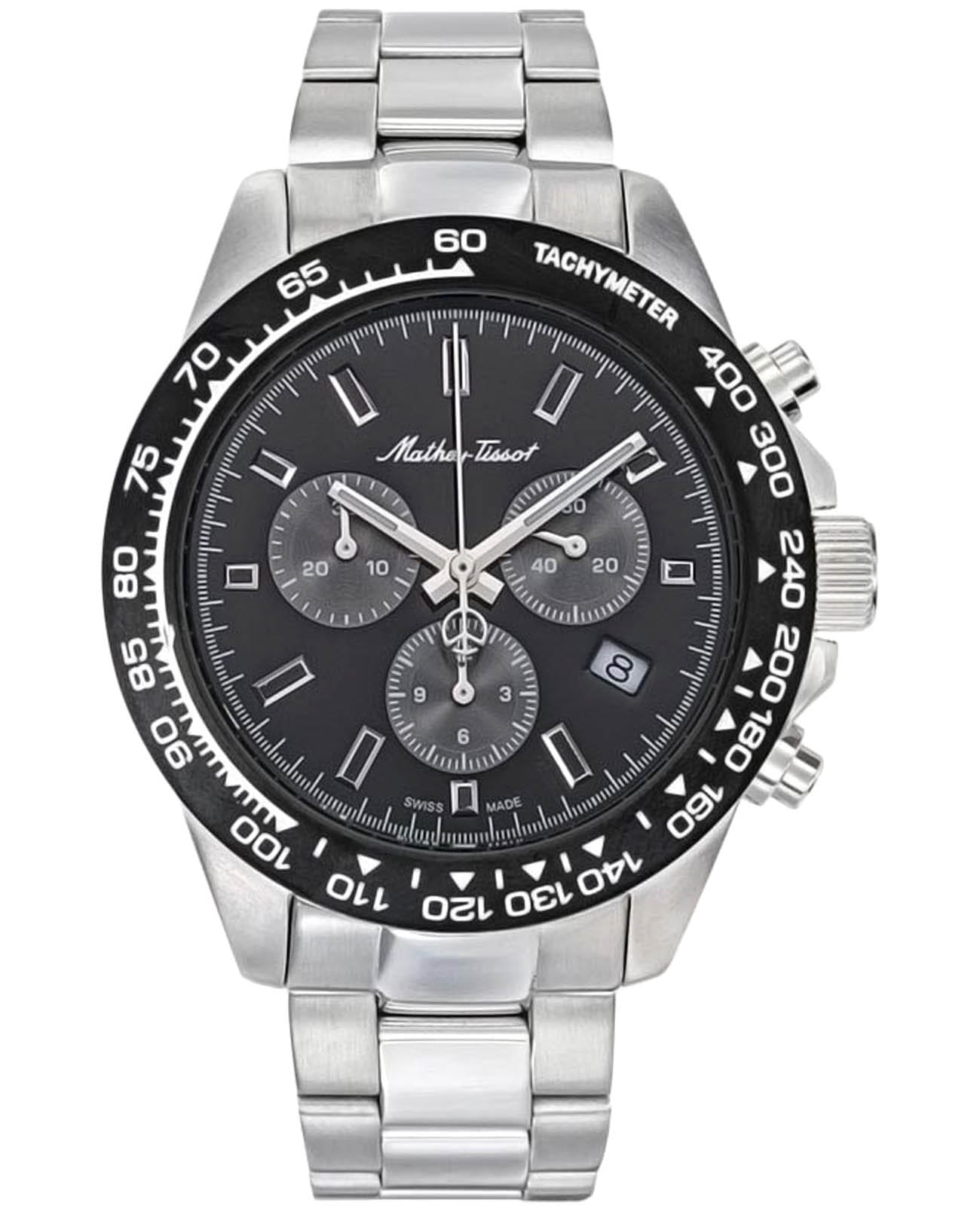 Мужские кварцевые часы-хронографХронографФункция позволяет измерять отрезки времени с особой точностью: часы, минуты, секунды. Верным признаком хронографа является наличие на циферблате 3 дополнительных окошек-счётчиков. с секундомеромСекундомерСекундоме́р — прибор, способный измерять интервалы времени с точностью до долей секунды. Mathey-Tissot Mathy H9010CHAN — это стильное сочетание элегантности и современного дизайна. Изящный корпус выполнен из нержавеющей стали, диаметром 42 мм, что придаст образу элегантности и надежности. Изысканный циферблат с метками в виде штрихов придает модели особый блеск. Циферблат защищен минеральным стекломМинеральное стеклоМинеральное стекло представляет собой искусственно выращенный минерал кварца. Такое стекло отличается особой устойчивостью к повреждениям и царапинам. Уступает по некоторым качествам сапфировому стеклу. с сапфировым покрытием, обеспечивает устойчивость к царапинам. Стрелки и метки с люминесцентным покрытиемЛюминесцентное покрытиеПозволяет считывать показания времени в темноте. Производители наносят на стрелки, часовые индексы, безель или поверхность циферблата светонакопительный состав, дающий холодное свечение.. Окошко даты находится в положении 4 часа. Часы оснащены надежным кварцевым механизмом. На безелеБезельВнешний ободок, закрепляющий стекло. В спортивных часах так называется поворотное кольцо с делениями на циферблате, выполняет роль таймера – замеряет отрезки времени на шкале. Неподвижный безель – элемент декора. Однонаправленно вращающийся безель на дайверских часах позволяет фиксировать моменты погружения и выныривания на поверхность. шкала тахиметраТахиметрРазмеченная шкала, располагается на ободке или безеле часов. Тахиметр позволяет рассчитать скорость на определённом участке пути, расстояние измеряется в километрах или милях.. Стальной браслет на раскладной застёжке с фиксаторомРаскладная застёжкаТакой тип застёжки используется только на браслетах из металла. Она никогда не раскрывается полностью, происходит разделение на 2 и более частей. Раскладывающая застёжка снизит вероятность потери часов к минимуму., гарантирует комфортное и безопасное ношение. Рифленая заводная головка. Класс водозащиты: 50 метров позволит защитить корпус от случайных брызг или капель дождя. Mathey-Tissot — отличный выбор для тех, кто ценит утонченность и качество.