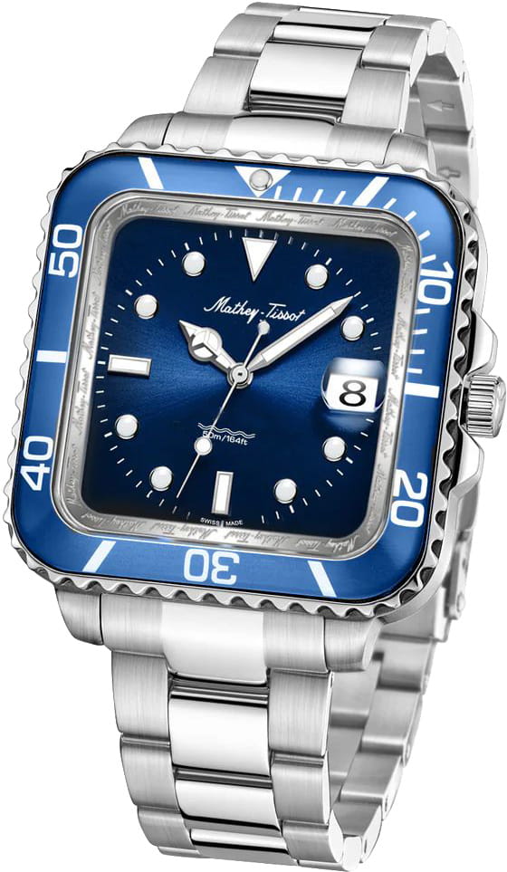 Мужские кварцевые часы Mathey-Tissot Mathy H902QABU — это стильное сочетание элегантности и современного дизайна. Изящный корпус выполнен из нержавеющей стали, диаметром 42 мм, что придаст образу элегантности и надежности. Изысканный циферблат с метками в виде точек придает модели особый блеск. Циферблат защищен сапфировым стекломСапфировое стеклоПрочный и надёжный материал из кристалла сапфира синтетического происхождения, характеризующийся особой твёрдостью и устойчивостью к царапинам и повреждениям., обеспечивает устойчивость к царапинам. Стрелки и метки с люминесцентным покрытиемЛюминесцентное покрытиеПозволяет считывать показания времени в темноте. Производители наносят на стрелки, часовые индексы, безель или поверхность циферблата светонакопительный состав, дающий холодное свечение. SuperLumiNova, которое светится в темноте после непродолжительной зарядки на свету. БезельБезельВнешний ободок, закрепляющий стекло. В спортивных часах так называется поворотное кольцо с делениями на циферблате, выполняет роль таймера – замеряет отрезки времени на шкале. Неподвижный безель – элемент декора. Однонаправленно вращающийся безель на дайверских часах позволяет фиксировать моменты погружения и выныривания на поверхность. с PVD-покрытиемPVDУльтратонкое покрытие наносится в технике вакуумного напыления, сочетает в себе нитрид титана особой прочности со слоем золота или оксида хрома. Несёт в себе декоративную или защитную функцию. синего цвета. Окошко даты находится в положении 3 часа. Стальной браслет на раскладной застёжке с фиксаторомРаскладная застёжкаТакой тип застёжки используется только на браслетах из металла. Она никогда не раскрывается полностью, происходит разделение на 2 и более частей. Раскладывающая застёжка снизит вероятность потери часов к минимуму., гарантирует комфортное и безопасное ношение. Рифленая заводная головка. Класс водозащиты: 50 метров позволит защитить корпус от случайных брызг или капель дождя. Mathey-Tissot — отличный выбор для тех, кто ценит утонченность и качество.