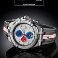 Синие, красные и серые цвета являются отсылкой к окраске автомобиля Mahindra гонки Formula E. Модель дополнена цветным ремешком в гоночной стилистике, а на задней крышке часов можно увидеть гравировку в виде гоночной формы команды Mahindra. Этот хронограф станет идеальным инструментом для обитателей пит-лейнов.