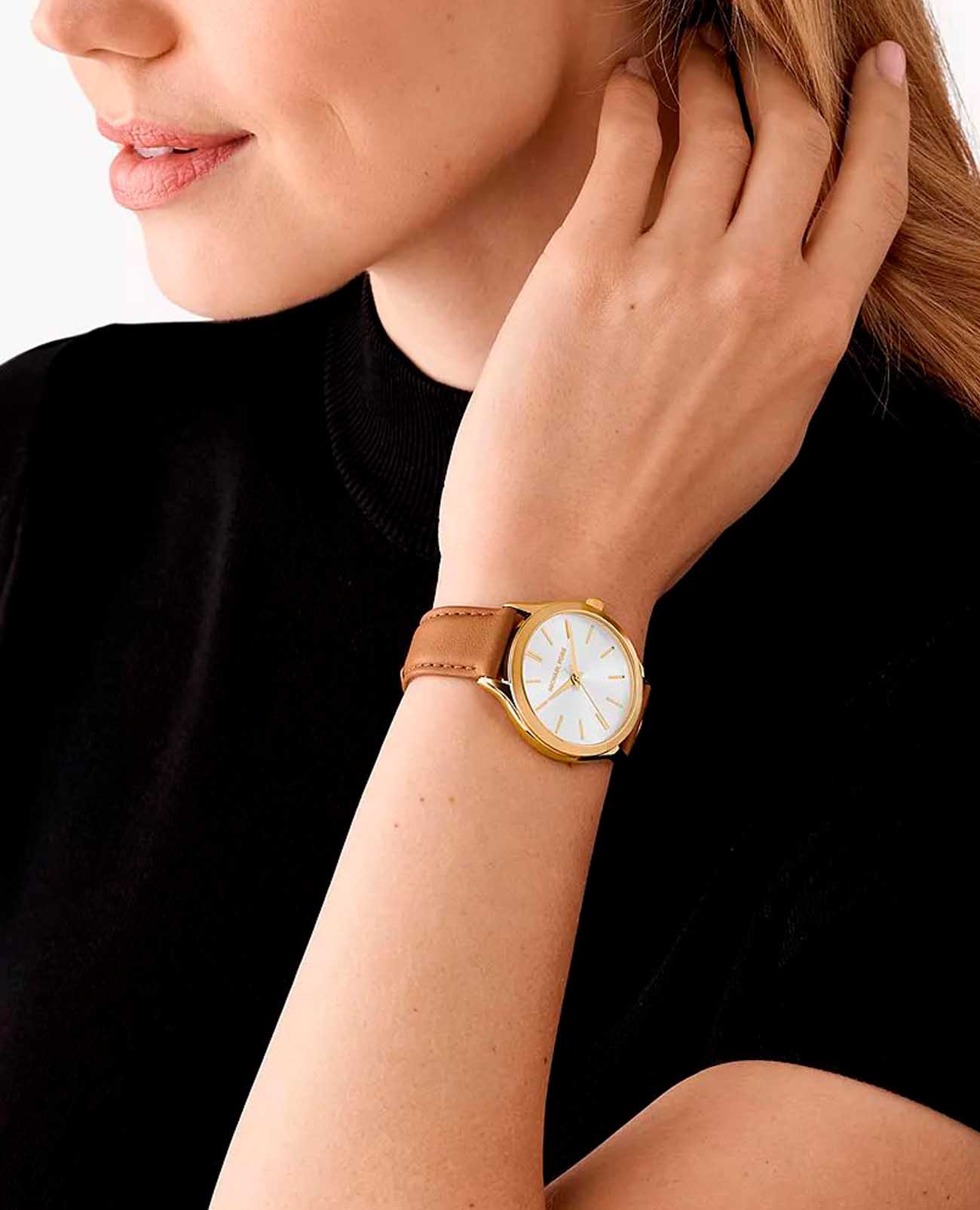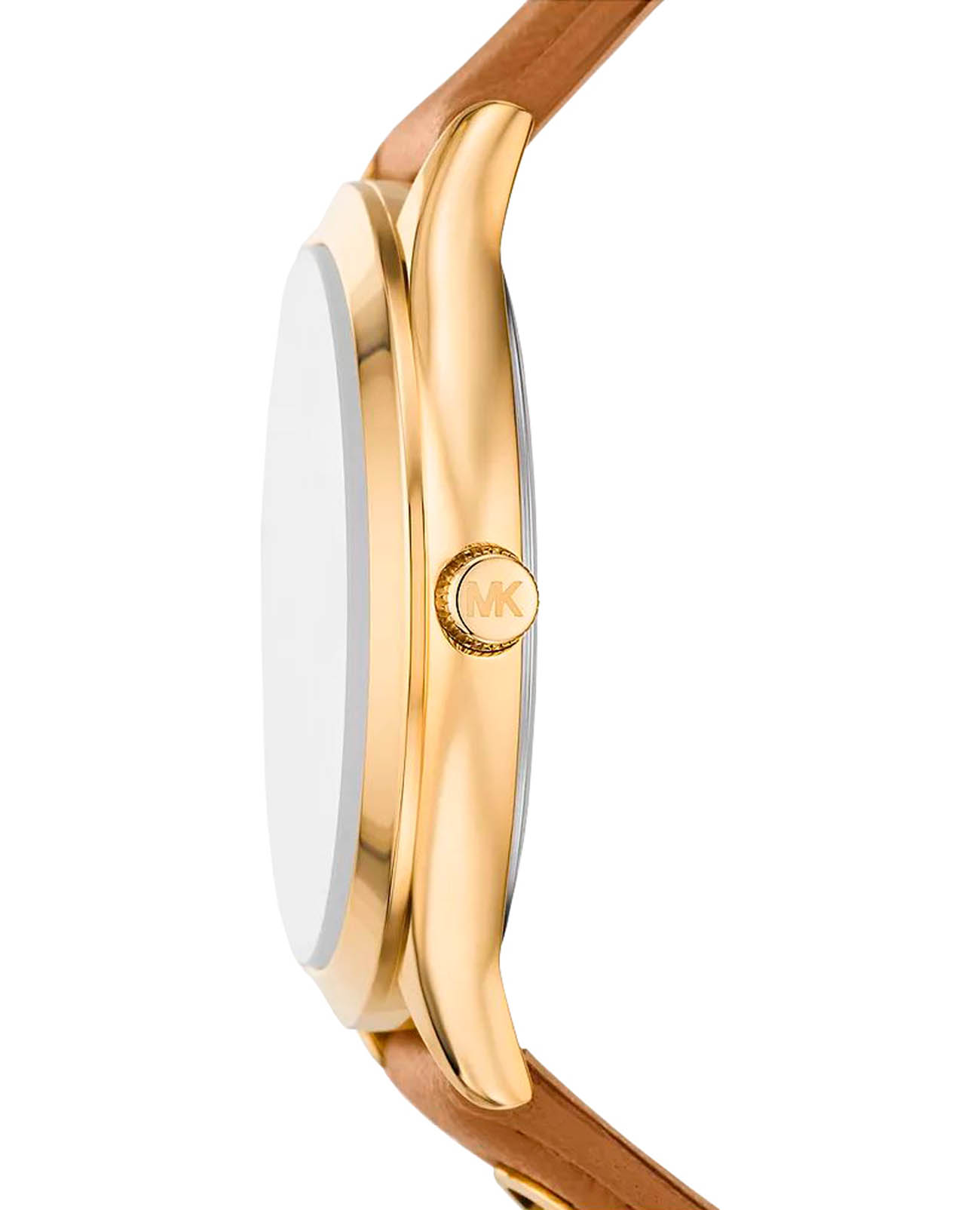 Женские американские часы с минеральным стекломМинеральное стеклоМинеральное стекло представляет собой искусственно выращенный минерал кварца. Такое стекло отличается особой устойчивостью к повреждениям и царапинам. Уступает по некоторым качествам сапфировому стеклу. Michael Kors Runway MK7465, кварцевый механизм с высокой точностью. Корпус часов изготовлен из нержавеющей стали с PVD-покрытиемPVDУльтратонкое покрытие наносится в технике вакуумного напыления, сочетает в себе нитрид титана особой прочности со слоем золота или оксида хрома. Несёт в себе декоративную или защитную функцию.. Класс водозащиты: 50 метров, позволит защитить корпус от случайных брызг или капель дождя. Стальной браслет из стали с PVD-покрытиемPVDУльтратонкое покрытие наносится в технике вакуумного напыления, сочетает в себе нитрид титана особой прочности со слоем золота или оксида хрома. Несёт в себе декоративную или защитную функцию. на раскладной застёжкеРаскладная застёжкаТакой тип застёжки используется только на браслетах из металла. Она никогда не раскрывается полностью, происходит разделение на 2 и более частей. Раскладывающая застёжка снизит вероятность потери часов к минимуму.. Кожаный ремешок на стандартной застежке.