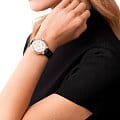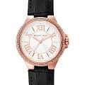 Женские американские часы с минеральным стекломМинеральное стеклоМинеральное стекло представляет собой искусственно выращенный минерал кварца. Такое стекло отличается особой устойчивостью к повреждениям и царапинам. Уступает по некоторым качествам сапфировому стеклу. Michael Kors Camille MK2962, кварцевый механизм с высокой точностью. Корпус часов изготовлен из стали с PVD-покрытиемPVDУльтратонкое покрытие наносится в технике вакуумного напыления, сочетает в себе нитрид титана особой прочности со слоем золота или оксида хрома. Несёт в себе декоративную или защитную функцию.. БезельБезельВнешний ободок, закрепляющий стекло. В спортивных часах так называется поворотное кольцо с делениями на циферблате, выполняет роль таймера – замеряет отрезки времени на шкале. Неподвижный безель – элемент декора. Однонаправленно вращающийся безель на дайверских часах позволяет фиксировать моменты погружения и выныривания на поверхность. украшен кристаллами. Метки в виде штрихов и римских цифр. Заводная головка с защитой. Класс водозащиты: 50 метров, позволит защитить корпус от случайных брызг или капель дождя. Кожаный ремешок на стандартной застежке.