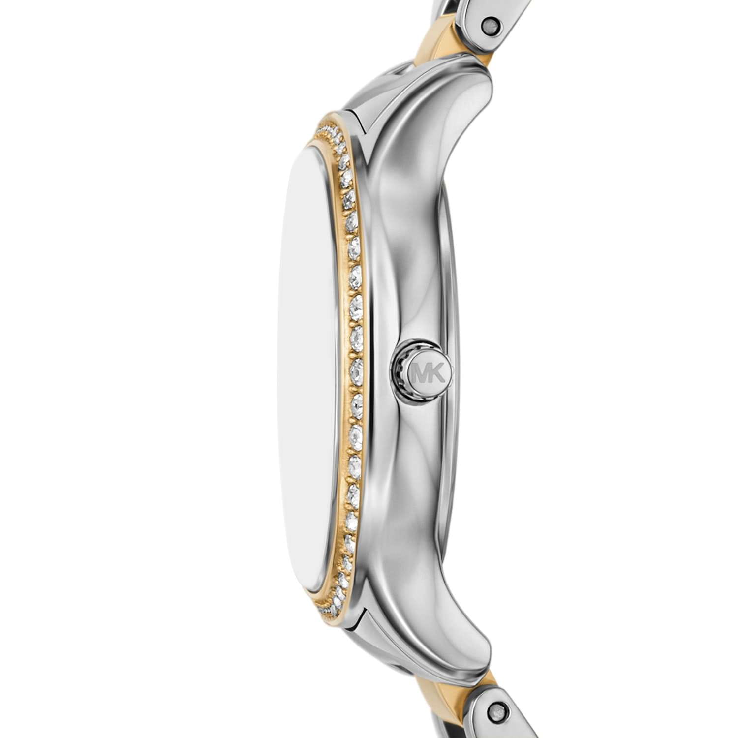 Женские американские часы Michael Kors SAGE MK4910 имеют кварцевый механизм с высокой точностью. Корпус часов изготовлен из нержавеющей стали серебристого цвета, диаметром 31 мм. Циферблат с метками в виде римских цифр защищен минеральным стекломМинеральное стеклоМинеральное стекло представляет собой искусственно выращенный минерал кварца. Такое стекло отличается особой устойчивостью к повреждениям и царапинам. Уступает по некоторым качествам сапфировому стеклу., что обеспечивает надежную защиту от царапин и повреждений. Неподвижный безельБезельВнешний ободок, закрепляющий стекло. В спортивных часах так называется поворотное кольцо с делениями на циферблате, выполняет роль таймера – замеряет отрезки времени на шкале. Неподвижный безель – элемент декора. Однонаправленно вращающийся безель на дайверских часах позволяет фиксировать моменты погружения и выныривания на поверхность. с PVD-покрытиемPVDУльтратонкое покрытие наносится в технике вакуумного напыления, сочетает в себе нитрид титана особой прочности со слоем золота или оксида хрома. Несёт в себе декоративную или защитную функцию. украшен кристаллами. Класс водозащиты: 50 метров позволит защитить корпус от случайных брызг или капель дождя. Стрелки с люминесцентным покрытиемЛюминесцентное покрытиеПозволяет считывать показания времени в темноте. Производители наносят на стрелки, часовые индексы, безель или поверхность циферблата светонакопительный состав, дающий холодное свечение.. Стальной браслет с частичным PVD-покрытиемPVDУльтратонкое покрытие наносится в технике вакуумного напыления, сочетает в себе нитрид титана особой прочности со слоем золота или оксида хрома. Несёт в себе декоративную или защитную функцию. на раскладной застёжкеРаскладная застёжкаТакой тип застёжки используется только на браслетах из металла. Она никогда не раскрывается полностью, происходит разделение на 2 и более частей. Раскладывающая застёжка снизит вероятность потери часов к минимуму. обеспечивает надежную фиксацию на запястье и легкость в надевании и снятии. Эти часы станут отличным дополнением к любому наряду, подчеркивая индивидуальность и стиль их обладательницы. Идеальный аксессуар, который придаст женскому образу завершенность и особый шарм.