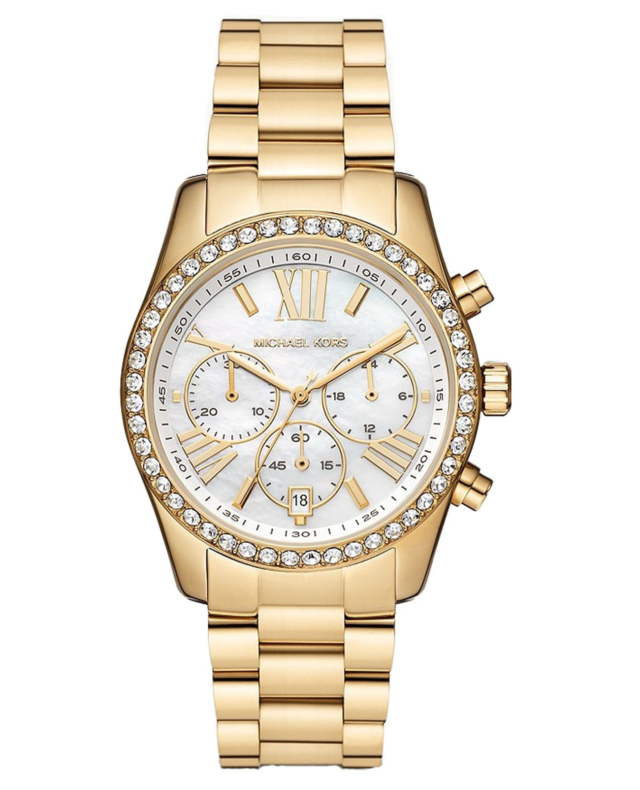 Женские американские часы-хронографХронографФункция позволяет измерять отрезки времени с особой точностью: часы, минуты, секунды. Верным признаком хронографа является наличие на циферблате 3 дополнительных окошек-счётчиков. с секундомеромСекундомерСекундоме́р — прибор, способный измерять интервалы времени с точностью до долей секунды. и с минеральным стекломМинеральное стеклоМинеральное стекло представляет собой искусственно выращенный минерал кварца. Такое стекло отличается особой устойчивостью к повреждениям и царапинам. Уступает по некоторым качествам сапфировому стеклу. Michael Kors Lexington MK7241, кварцевый механизм с высокой точностью. Корпус часов изготовлен из нержавеющей стали с PVD-покрытиемPVDУльтратонкое покрытие наносится в технике вакуумного напыления, сочетает в себе нитрид титана особой прочности со слоем золота или оксида хрома. Несёт в себе декоративную или защитную функцию.. БезельБезельВнешний ободок, закрепляющий стекло. В спортивных часах так называется поворотное кольцо с делениями на циферблате, выполняет роль таймера – замеряет отрезки времени на шкале. Неподвижный безель – элемент декора. Однонаправленно вращающийся безель на дайверских часах позволяет фиксировать моменты погружения и выныривания на поверхность. украшен кристаллами. Три дополнительных индикатора. Метки в виде штрихов и римских цифр. Окошко даты находится в положении 6 часов. Класс водозащиты: 100 метров, позволит плавать, нырять и заниматься другими водными видами спорта. Стальной браслет с PVD-покрытиемPVDУльтратонкое покрытие наносится в технике вакуумного напыления, сочетает в себе нитрид титана особой прочности со слоем золота или оксида хрома. Несёт в себе декоративную или защитную функцию. на раскладной застёжкеРаскладная застёжкаТакой тип застёжки используется только на браслетах из металла. Она никогда не раскрывается полностью, происходит разделение на 2 и более частей. Раскладывающая застёжка снизит вероятность потери часов к минимуму..