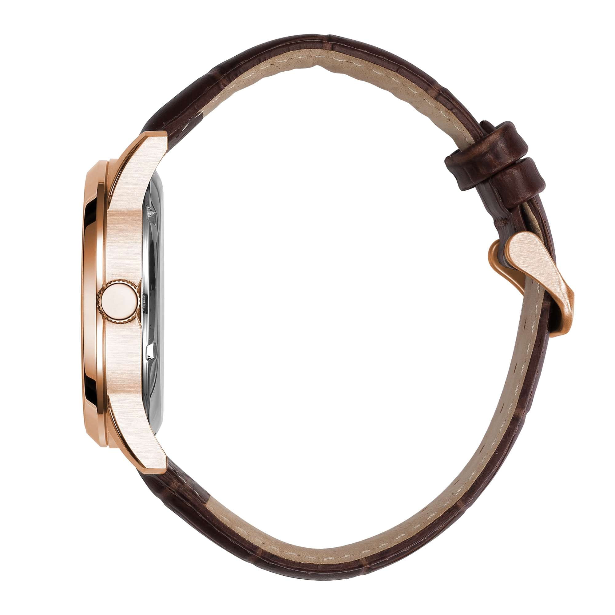 Корпус мужских часов Mikhail Moskvin 1507S3L5 выполнен из нержавеющей стали с ip-покрытиемIP-покрытиеМетод ионного напыления. Демонстрирует повышенную устойчивость к истиранию, окислению и химическим веществам. Под воздействием высокого давления и температуры около 1500°C молекулы металла надёжно соединяются с частицами корпуса часов., диаметром 43 мм, золотого цвета. Механизм механический с автоподзаводом, возможен ручной завод. Циферблат чёрного цвета стрелочный с метками, защищён минеральным стекломМинеральное стеклоМинеральное стекло представляет собой искусственно выращенный минерал кварца. Такое стекло отличается особой устойчивостью к повреждениям и царапинам. Уступает по некоторым качествам сапфировому стеклу.. Модель имеет скелетонизированный дизайн, рифленую заводную головку. Ремень из натуральной кожи с имитацией кожи крокодила шириной 22 мм со стандартной застёжкой, максимальный обхват запястья 220 мм. Водозащита 5 АТМ, рассчитана на защиту от брызг и дождя.