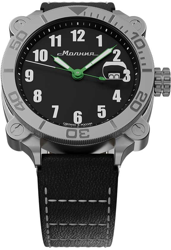 Мужские механические часы с автоподзаводом от бренда «МОЛНИЯ» — это стильный аксессуар, вдохновлённый дизайном приборной панели легендарного танка Т-72. Корпус диаметром 42 мм и толщиной 12 мм выполнен из нержавеющей стали 316L с матовой полировкой. БезельБезельВнешний ободок, закрепляющий стекло. В спортивных часах так называется поворотное кольцо с делениями на циферблате, выполняет роль таймера – замеряет отрезки времени на шкале. Неподвижный безель – элемент декора. Однонаправленно вращающийся безель на дайверских часах позволяет фиксировать моменты погружения и выныривания на поверхность. однонаправленный, вращающийся. Циферблат чёрного цвета оформлен арабскими цифрами и логотипом бренда. Окошко даты расположено в положении 3 часов и оснащено увеличительным стеклом. Стрелки и метки с люминесцентным покрытиемЛюминесцентное покрытиеПозволяет считывать показания времени в темноте. Производители наносят на стрелки, часовые индексы, безель или поверхность циферблата светонакопительный состав, дающий холодное свечение. Super-LumiNova. Циферблат защищён сапфировым стекломСапфировое стеклоПрочный и надёжный материал из кристалла сапфира синтетического происхождения, характеризующийся особой твёрдостью и устойчивостью к царапинам и повреждениям. с антибликовым покрытиемАнтибликовое покрытиеСлой оксида металла в 0,13-0,3 микрон, благодаря которому стекло часов не бликует и не отражает свет. Антибликовое покрытие уменьшает отражение света в 10 раз, обеспечивая отличную читаемость показателей циферблата.. Механизм — японский автоматический калибр Miyota 8215 запас хода до 42 часов. Заводная головка стилизована под гусеничную ленту, задняя крышка с гравировкой танка Т-72. Часы оснащены кожаным ремешком чёрного цвета с классической пряжкой и системой быстрой замены. Водонепроницаемость 100 м позволяет использовать часы для плавания и повседневного ношения. Идеальный выбор для тех, кто ценит инженерное наследие и мощный дизайн.