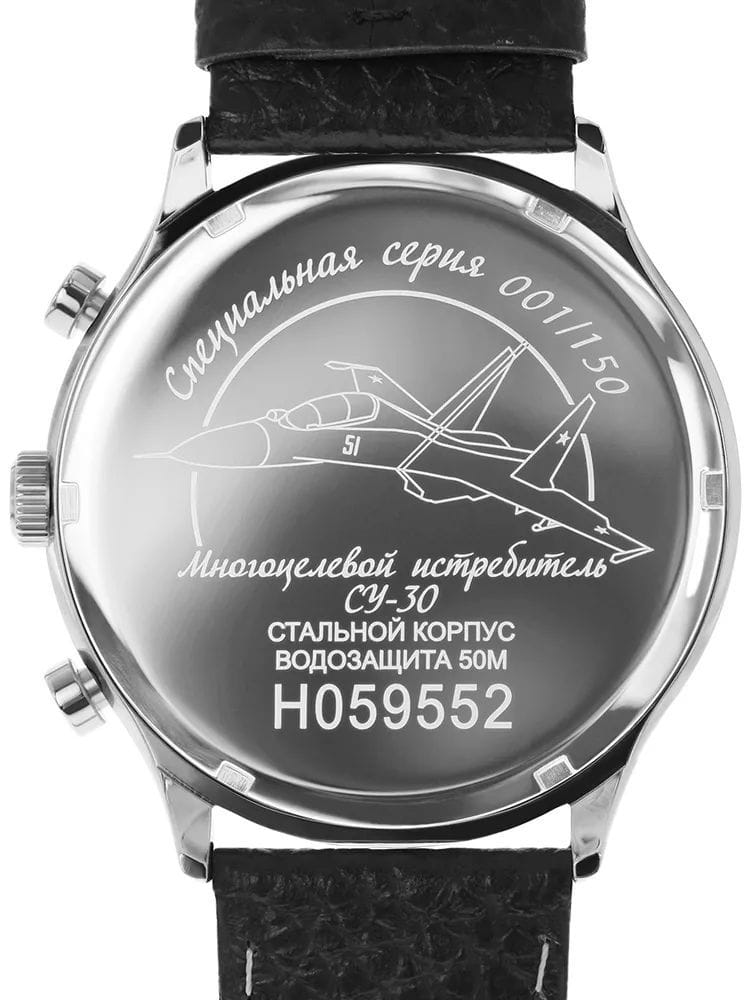 Ремешок выполнен из натуральной кожи чёрного цвета, обеспечивая комфорт при носке. Толщина корпуса составляет 13 мм, что придаёт часам солидный вид. На задней крышке корпуса нанесена гравировка с изображением многоцелевого истребителя Су-30, подчёркивая уникальность и коллекционную ценность модели.