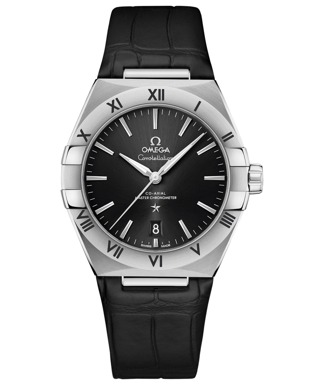 Драматичный и неизменный дизайн OMEGA Constellation характеризуется знаменитыми полумесяцами, а также «скобами» на боковой стороне корпуса. Эта 39-миллиметровая модель из нержавеющей стали оснащена безелемБезельВнешний ободок, закрепляющий стекло. В спортивных часах так называется поворотное кольцо с делениями на циферблате, выполняет роль таймера – замеряет отрезки времени на шкале. Неподвижный безель – элемент декора. Однонаправленно вращающийся безель на дайверских часах позволяет фиксировать моменты погружения и выныривания на поверхность. с черными римскими цифрами, черным циферблатом с матовым покрытием и окошком даты в положении «6 часов». Стрелки, логотип OMEGA, звезда Constellation и индексы выполнены из белого золота 18 карат18-каратное золотоОбозначение по каратной системе пробирования, оно показывает, сколько драгоценного металла содержится в изделии. 18 карат - в составе 75% чистого золота, соответствует 750 пробе.