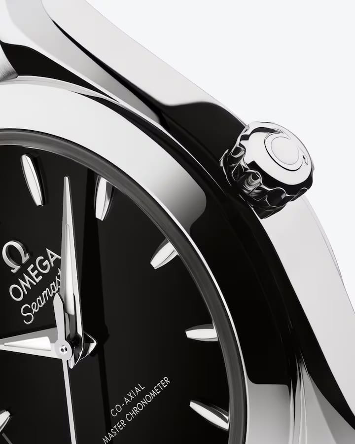 Часы Omega Seamaster Aqua Terra выполнены в симметричном корпусе из нержавеющей стали с завинчивающейся задней крышкой, украшенной волновым узором. Циферблат чёрного цвета дополнен окошком даты на 6 часах и 11 индексами в форме корпусов парусников. Стрелки переработанной формы выполнены из 18K белого золота и оснащены люминесцентным покрытиемЛюминесцентное покрытиеПозволяет считывать показания времени в темноте. Производители наносят на стрелки, часовые индексы, безель или поверхность циферблата светонакопительный состав, дающий холодное свечение. Super-LumiNova для лучшей читаемости в темноте. Калибр Omega 8750 сертифицирован как Master Chronometer — гарантия высочайшей точности и устойчивости к магнитным полям. Запас хода составляет 48 часов. Защиту циферблата обеспечивает сапфировое стеклоСапфировое стеклоПрочный и надёжный материал из кристалла сапфира синтетического происхождения, характеризующийся особой твёрдостью и устойчивостью к царапинам и повреждениям. с антибликовым покрытиемАнтибликовое покрытиеСлой оксида металла в 0,13-0,3 микрон, благодаря которому стекло часов не бликует и не отражает свет. Антибликовое покрытие уменьшает отражение света в 10 раз, обеспечивая отличную читаемость показателей циферблата. с обеих сторон. Водозащита позволяет использовать часы в воде без риска повреждения. Диаметр корпуса — 30 мм, между "ушками" — 14 мм, толщина — 10.6 мм, общая длина между "ушками" — 36.5 мм. Часы установлены на интегрированный стальной браслет с закруглёнными звеньями и застёжкой-бабочкой с кнопкамиЗастёжка "бабочка"Такой вид застёжки дополняется предохранителями, помогающими избежать случайного раскрытия браслета. Обладают изящным исполнением. , обеспечивающим комфорт при ношении. Вес модели — около 81 грамма. Это сочетание премиального качества, технологичности и классического дизайна.