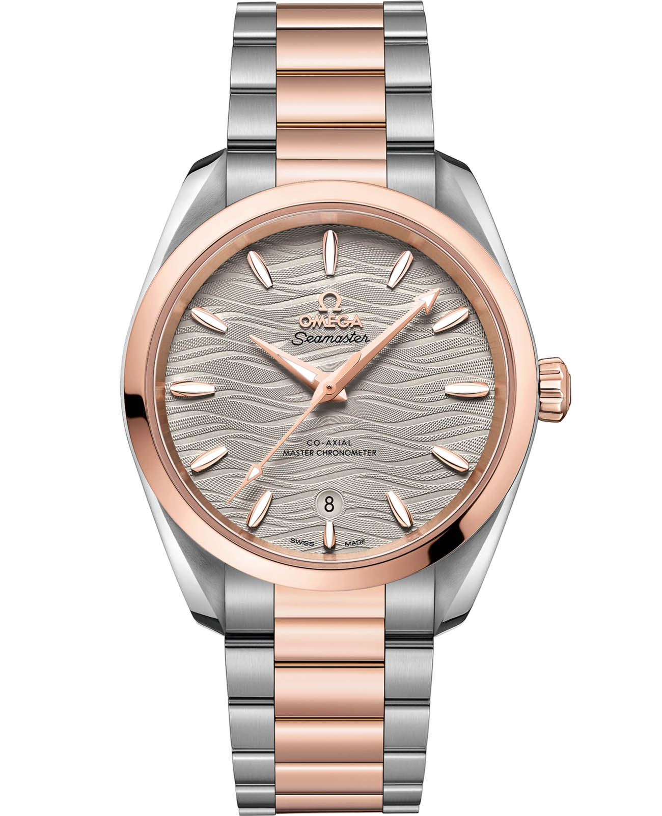 Omega Seamaster Aqua Terra выполнены в симметричном корпусе из нержавеющей стали и 18K Sedna™ золота с завинчивающейся задней крышкой, украшенной волновым узором. Циферблат украшен гильошированием "морские волны" и дополнен окошком даты на 6 часах. Стрелки и метки оснащены люминесцентным покрытиемЛюминесцентное покрытиеПозволяет считывать показания времени в темноте. Производители наносят на стрелки, часовые индексы, безель или поверхность циферблата светонакопительный состав, дающий холодное свечение. Super-LumiNova для лучшей читаемости в темноте. Калибр Omega 8800 сертифицирован как Master Chronometer — гарантия высочайшей точности и устойчивости к магнитным полям. Запас хода составляет 55 часов. Защиту циферблата обеспечивает сапфировое стеклоСапфировое стеклоПрочный и надёжный материал из кристалла сапфира синтетического происхождения, характеризующийся особой твёрдостью и устойчивостью к царапинам и повреждениям. с антибликовым покрытиемАнтибликовое покрытиеСлой оксида металла в 0,13-0,3 микрон, благодаря которому стекло часов не бликует и не отражает свет. Антибликовое покрытие уменьшает отражение света в 10 раз, обеспечивая отличную читаемость показателей циферблата.. Водозащита позволяет использовать часы в воде без риска повреждения. Часы установлены на комбинированный браслет из 18K Sedna™ золота и нержавеющей стали с застёжка «бабочка» с кнопкамиЗастёжка "бабочка"Такой вид застёжки дополняется предохранителями, помогающими избежать случайного раскрытия браслета. Обладают изящным исполнением. . Это сочетание премиального качества, технологичности и классического дизайна.