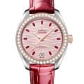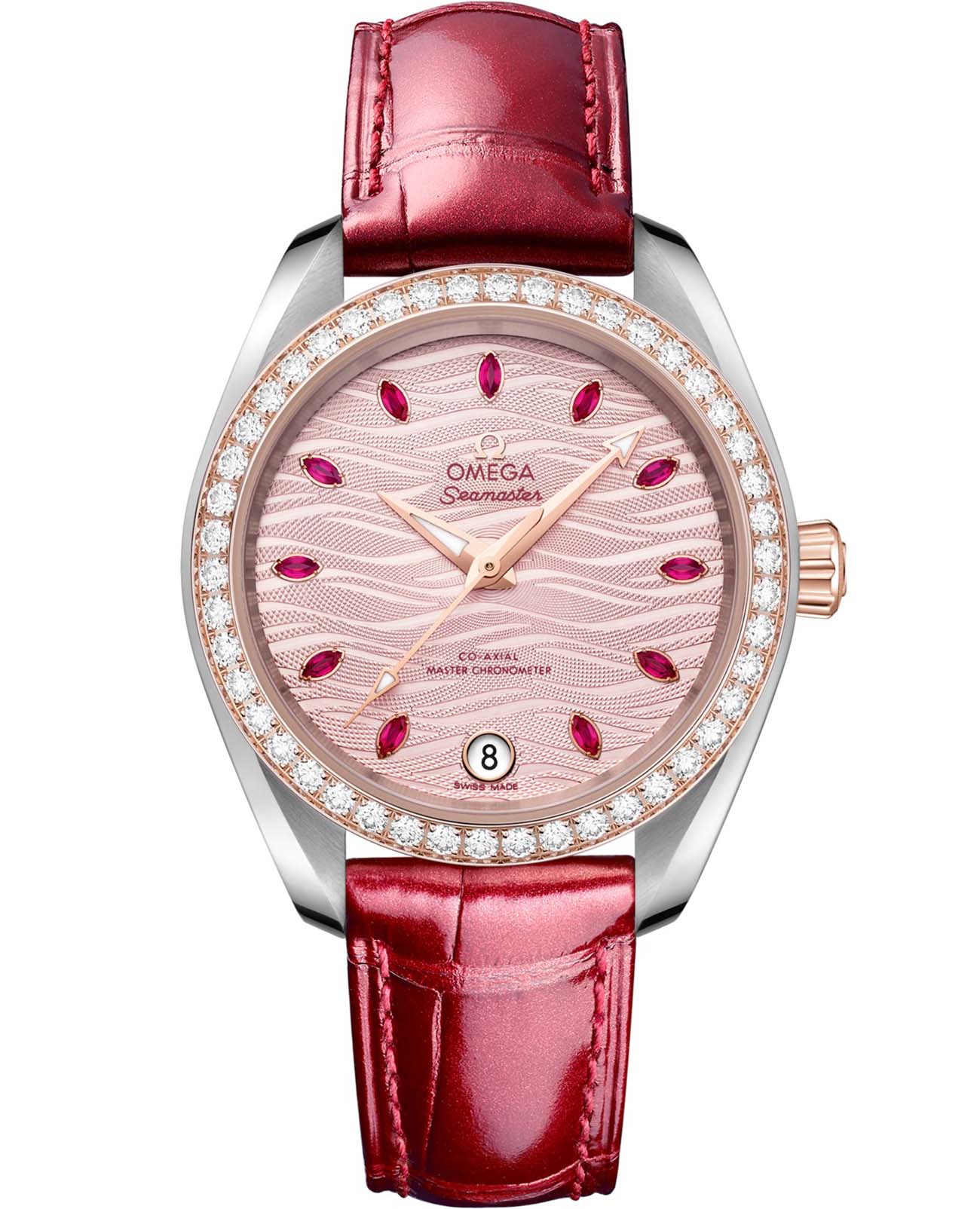 Женские часы Omega Seamaster Aqua Terra выполнены в симметричном корпусе из нержавеющей стали и 18K Sedna™ золота с завинчивающейся задней крышкой, украшенной волновым узором. Безель полированный и инкрустирован бриллиантами, что подчеркивает их роскошный дизайн. Циферблат нежно-розового цвета имеет текстуру в виде волн, окошко даты на 6 часах и 11 часовых меток в виде рубинов маркизной огранки. Стрелки выполнены из 18K Sedna™ золота с алмазной полировкой и оснащены люминесцентным покрытиемЛюминесцентное покрытиеПозволяет считывать показания времени в темноте. Производители наносят на стрелки, часовые индексы, безель или поверхность циферблата светонакопительный состав, дающий холодное свечение. для лучшей читаемости в темноте. Калибр Omega 8800 сертифицирован как Master Chronometer — гарантия высочайшей точности и устойчивости к магнитным полям. Запас хода составляет 55 часов. Защиту циферблата обеспечивает сапфировое стеклоСапфировое стеклоПрочный и надёжный материал из кристалла сапфира синтетического происхождения, характеризующийся особой твёрдостью и устойчивостью к царапинам и повреждениям. с антибликовым покрытиемАнтибликовое покрытиеСлой оксида металла в 0,13-0,3 микрон, благодаря которому стекло часов не бликует и не отражает свет. Антибликовое покрытие уменьшает отражение света в 10 раз, обеспечивая отличную читаемость показателей циферблата. с обеих сторон. Водозащита позволяет использовать часы в воде без риска повреждения. Часы установлены на кожаный ремешок красного цвета. Вес модели — около 65 грамм. Это сочетание премиального качества, технологичности и классического дизайна.
