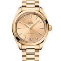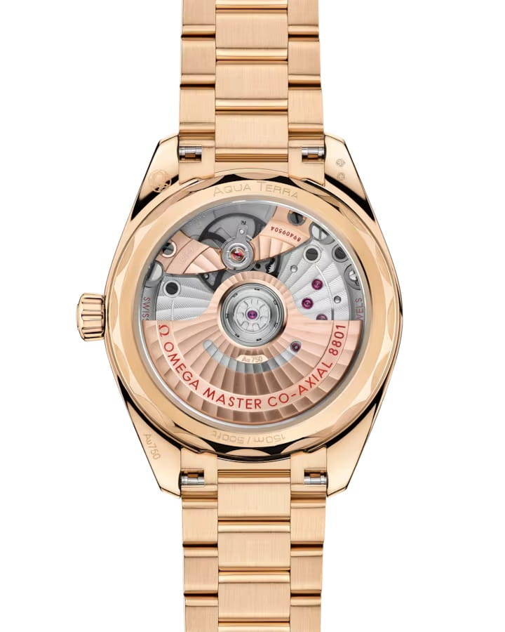 Часы Omega Seamaster Aqua Terra выполнены в симметричном корпусе из 18K Moonshine™ золота с завинчивающейся задней крышкой, украшенной волновым узором. Циферблат жёлтого цвета выполнен методом солнечной шлифовки и дополнен окошком даты на 6 часах, оформленным в том же сплаве. Стрелки и метки выполнены из 18K Moonshine™ золота и оснащены люминесцентным покрытиемЛюминесцентное покрытиеПозволяет считывать показания времени в темноте. Производители наносят на стрелки, часовые индексы, безель или поверхность циферблата светонакопительный состав, дающий холодное свечение. Super-LumiNova для лучшей читаемости в темноте. Индексы в форме корпусов парусников подчёркивают морское наследие коллекции. Калибр Omega 8801 сертифицирован как Master Chronometer — гарантия высочайшей точности и устойчивости к магнитным полям. Запас хода составляет 55 часов. Защиту циферблата обеспечивает сапфировое стеклоСапфировое стеклоПрочный и надёжный материал из кристалла сапфира синтетического происхождения, характеризующийся особой твёрдостью и устойчивостью к царапинам и повреждениям. с антибликовым покрытиемАнтибликовое покрытиеСлой оксида металла в 0,13-0,3 микрон, благодаря которому стекло часов не бликует и не отражает свет. Антибликовое покрытие уменьшает отражение света в 10 раз, обеспечивая отличную читаемость показателей циферблата. с обеих сторон. Водозащита позволяет использовать часы в воде без риска повреждения. Часы установлены на интегрированный браслет с полированными центральными звеньями и матовыми внешними. Это сочетание премиального качества, технологичности и классического дизайна.