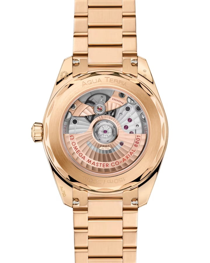 Omega Seamaster Aqua Terra выполнены в симметричном корпусе из 18K Moonshine™ золота с завинчивающейся задней крышкой, украшенной волновым узором. Циферблат дополнен окошком даты на 6 часах и оформлен с применением технологии sun-brushed с PVD-покрытием, напоминающим гладь воды. Стрелки и метки выполнены из 18K Moonshine™ золота и оснащены люминесцентным покрытиемЛюминесцентное покрытиеПозволяет считывать показания времени в темноте. Производители наносят на стрелки, часовые индексы, безель или поверхность циферблата светонакопительный состав, дающий холодное свечение. Super-LumiNova голубого цвета для лучшей читаемости в темноте. Калибр Omega 8801 сертифицирован как Master Chronometer — гарантия высочайшей точности и устойчивости к магнитным полям. Запас хода составляет 55 часов. Защиту циферблата обеспечивает сапфировое стеклоСапфировое стеклоПрочный и надёжный материал из кристалла сапфира синтетического происхождения, характеризующийся особой твёрдостью и устойчивостью к царапинам и повреждениям. с антибликовым покрытиемАнтибликовое покрытиеСлой оксида металла в 0,13-0,3 микрон, благодаря которому стекло часов не бликует и не отражает свет. Антибликовое покрытие уменьшает отражение света в 10 раз, обеспечивая отличную читаемость показателей циферблата. с обеих сторон. Водозащита позволяет использовать часы в воде без риска повреждения. Часы установлены на интегрированный браслет с полированными центральными и матовыми внешними звеньями. Это сочетание премиального качества, технологичности и классического дизайна.