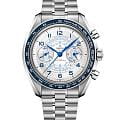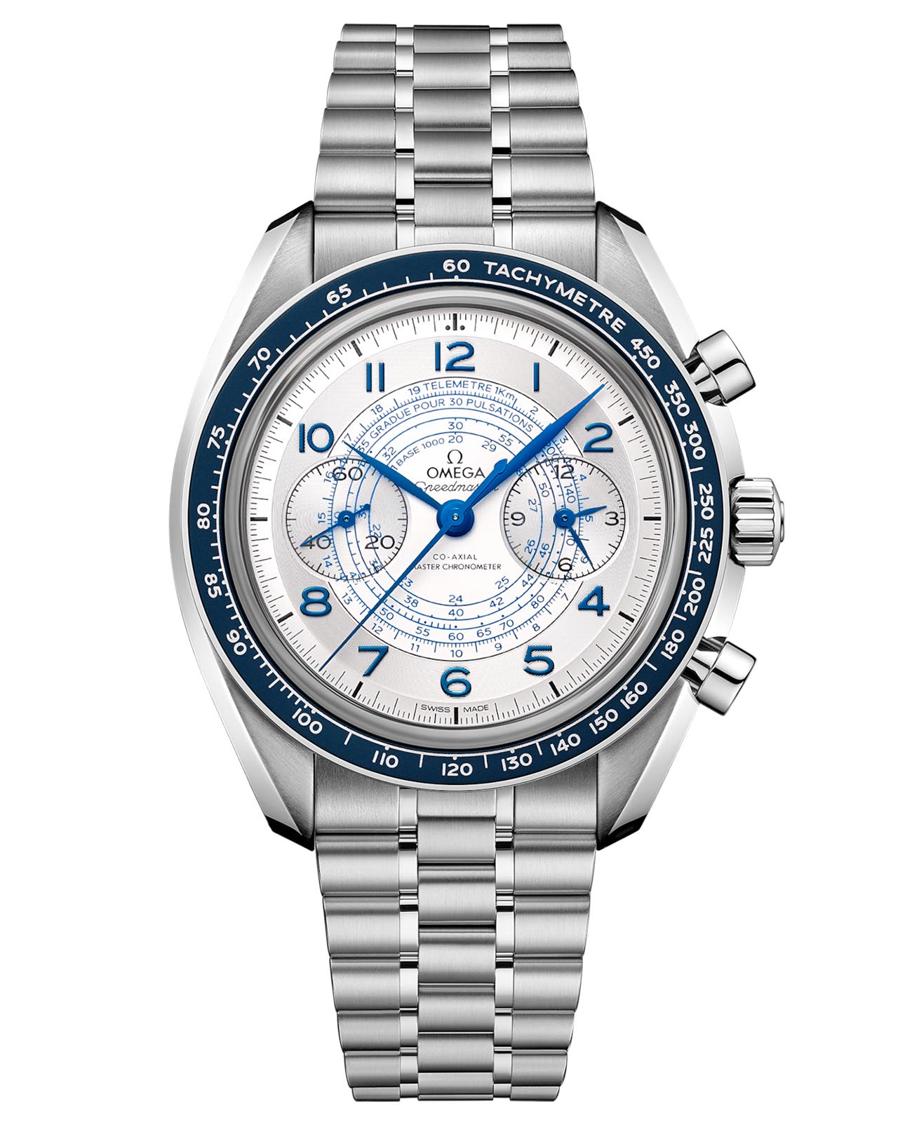 Chronoscope воплощает дух винтажных хронографов OMEGA 1940-х, мастерски переосмысленный через призму легендарного Speedmaster. 43-мм корпус из нержавеющей стали с синим безелемБезельВнешний ободок, закрепляющий стекло. В спортивных часах так называется поворотное кольцо с делениями на циферблате, выполняет роль таймера – замеряет отрезки времени на шкале. Неподвижный безель – элемент декора. Однонаправленно вращающийся безель на дайверских часах позволяет фиксировать моменты погружения и выныривания на поверхность. из анодированного алюминия представляет серебристый циферблат, украшенный тахиметрической шкалойТахиметрРазмеченная шкала, располагается на ободке или безеле часов. Тахиметр позволяет рассчитать скорость на определённом участке пути, расстояние измеряется в километрах или милях. и спиралевидным узором. Синие стрелки в форме листьев и арабские цифры добавляют характерный ретро-акцент. Три исторические шкалы в форме улитки - тахиметрическая, пульсометрическая и телеметрическая - создают уникальный измерительный комплекс. Функциональные счетчики на 3 и 9 часах гармонично интегрированы в дизайн. Браслет из нержавеющей стали завершает образ, а калибр OMEGA Co-Axial Master Chronometer 9908 гарантирует прецизионную точность, соединяя наследие с инновациями.