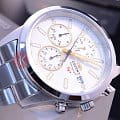 Серебристый аксессуар имеет люминесцентную подсветкуЛюминесцентное покрытиеПозволяет считывать показания времени в темноте. Производители наносят на стрелки, часовые индексы, безель или поверхность циферблата светонакопительный состав, дающий холодное свечение., что позволяет пользоваться часами в темноте. Полезными функциями являются секундомер и отображение даты. Японский кварцевый механизм обеспечивает высокую точность хода. Модель сделана из стали 316L, материал ценится за привлекательный внешний вид, устойчивость к повреждениям. Минеральное стекло не допускает появления царапин.
