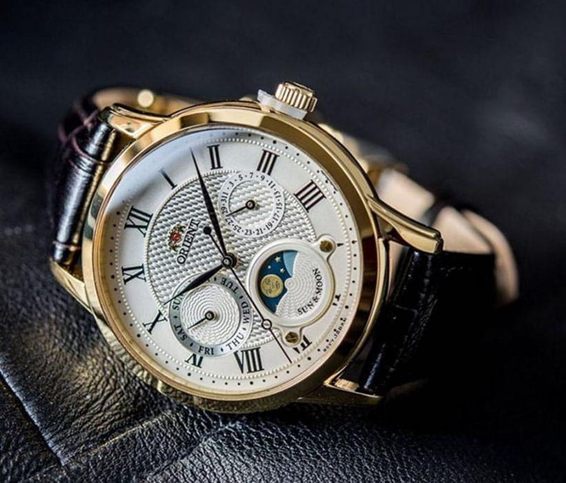 Наручные часы являются отражением винтажного стиля, гильошированный белый циферблат дополнен тонкими римскими цифрами, изысканности придаёт классический чёрный ремешок из натуральной кожи. Уникальность модели в нижнем окошке с изображением луны и солнца, так дизайнеры красиво преподносят нам смену дня и ночи. Кварцевый высокоточный калибр Orient KUE00. Сапфировое стекло. Водозащита до 5 бар. Корпус из хирургической стали 316L с цветным PVD-финишемPVDУльтратонкое покрытие наносится в технике вакуумного напыления, сочетает в себе нитрид титана особой прочности со слоем золота или оксида хрома. Несёт в себе декоративную или защитную функцию. золотистого оттенка. Отображение числа и дня недели. Диаметр корпуса: 43,8 мм.