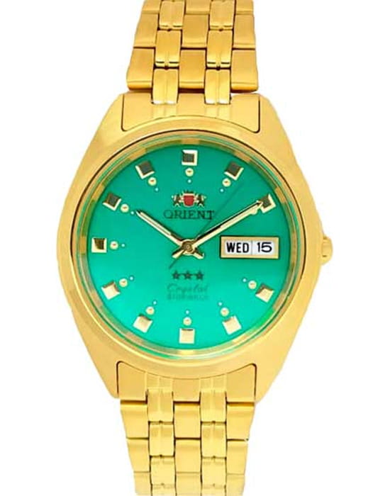 Модель Orient AB00001N из серии Three Stars — это классические японские автоматические часы, сочетающие надёжность и винтажную эстетику. Корпус диаметром 37 мм и браслет выполнены из нержавеющей стали с полированным золотистым покрытием. Зелёный циферблат с солнечной шлифовкой дополнен стрелками и метками, покрытыми люминесцентным покрытиемЛюминесцентное покрытиеПозволяет считывать показания времени в темноте. Производители наносят на стрелки, часовые индексы, безель или поверхность циферблата светонакопительный состав, дающий холодное свечение., обеспечивая отличную читаемость в любых условиях.
