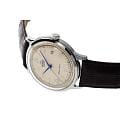 Циферблат сливочного оттенка с лёгким сатиновым блеском оформлен в классическом стиле: римские цифры, тонкие стрелки насыщенного синего цвета и небольшое окно даты у отметки «3 часа». Всё это подчёркивает сдержанную аристократичность модели.