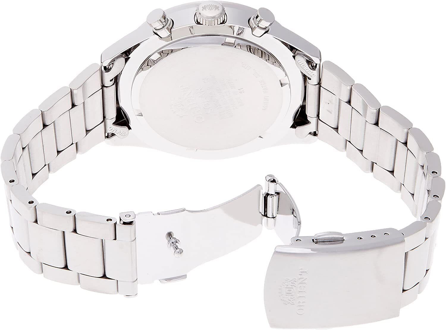 Мужские наручные часы-хронографХронографФункция позволяет измерять отрезки времени с особой точностью: часы, минуты, секунды. Верным признаком хронографа является наличие на циферблате 3 дополнительных окошек-счётчиков. Orient WV0041TX из коллекции Neo 70's Solar Chronograph Panda сочетают в себе ретро-дизайн 70-х годов и современные технологии. Модель обладает круглым корпусом диаметром 42 мм, изготовленным из нержавеющей стали, что обеспечивает высокую устойчивость к внешним воздействиям [[3]]. Браслет выполнен из нержавеющей стали на раскладной застёжкеРаскладная застёжкаТакой тип застёжки используется только на браслетах из металла. Она никогда не раскрывается полностью, происходит разделение на 2 и более частей. Раскладывающая застёжка снизит вероятность потери часов к минимуму., гарантирующей комфортное ношение и безопасность. Белый циферблат, напоминающий "панду", оснащен тонкими индексами для лучшей читаемости времени и хронографическими подциферблатами. Для защиты применяется минеральное стекло, обеспечивающее прочную защиту от царапин. Часы работают на солнечном кварцевом механизме, который питается от естественного и искусственного света, исключая необходимость замены батарейки. Модель также является хронографом, оснащенным функцией секундомераСекундомерСекундоме́р — прибор, способный измерять интервалы времени с точностью до долей секунды., делая её идеальной для активного образа жизни. Водонепроницаемость часов достигает 10 атмосфер (100 метров), что позволяет использовать их во время плавания и других водных видов спорта, однако не рекомендуется для глубоководного дайвинга.
