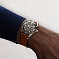 Многокомпонентный корпус из бронзы и стали, вращающийся безельБезельВнешний ободок, закрепляющий стекло. В спортивных часах так называется поворотное кольцо с делениями на циферблате, выполняет роль таймера – замеряет отрезки времени на шкале. Неподвижный безель – элемент декора. Однонаправленно вращающийся безель на дайверских часах позволяет фиксировать моменты погружения и выныривания на поверхность. с минутной шкалой . Сапфировое стеклоСапфировое стеклоПрочный и надёжный материал из кристалла сапфира синтетического происхождения, характеризующийся особой твёрдостью и устойчивостью к царапинам и повреждениям., выпуклое с обеих сторон, внутреннее антибликовое покрытие. Прозрачная задняя крышка из сапфирового стеклаСапфировое стеклоПрочный и надёжный материал из кристалла сапфира синтетического происхождения, характеризующийся особой твёрдостью и устойчивостью к царапинам и повреждениям.. Стрелки и метки с люминесцентным покрытиемЛюминесцентное покрытиеПозволяет считывать показания времени в темноте. Производители наносят на стрелки, часовые индексы, безель или поверхность циферблата светонакопительный состав, дающий холодное свечение.. Завинчивающаяся заводная головка.