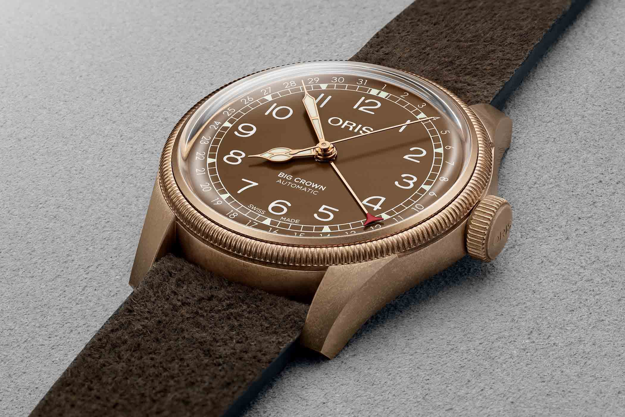 Бронзовые часы Oris Big Crown Pointer Date, показывающие время и дату, - это нечто большее, чем кажется. Впервые представленные в 1938, принципы их дизайна сохраняются и сегодня. Несмотря на то, что часы претерпели материальные и механические усовершенствования, их вечный новаторский дух сохраняется.