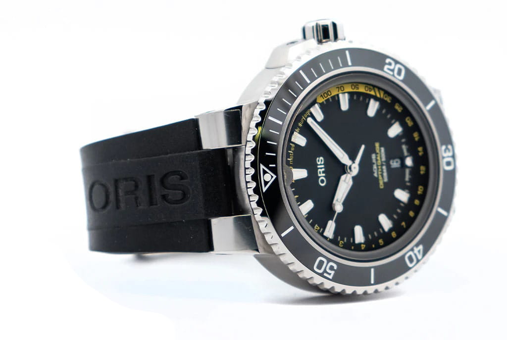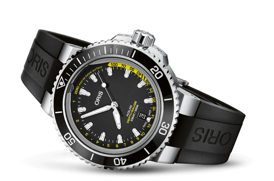 Часы Aquis Depth Gauge, известные под доброжелательным прозвищем «часы с отверстием в корпусе», используют закон Бойля-Мариотта как основу для функционирования датчика глубины погружения. Запатентованная конструкция позволяет воде проходить в канал, проточенный вдоль внешней кромки сапфирового часового стекла, сквозь отверстие, расположенное у 12-часового маркера. При этом возникает граница, разделяющая воду и воздух, – это и есть указатель глубины погружения, которая определяется по желтой шкале на циферблате.