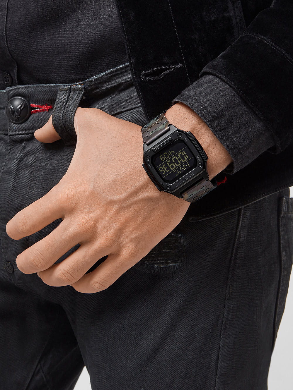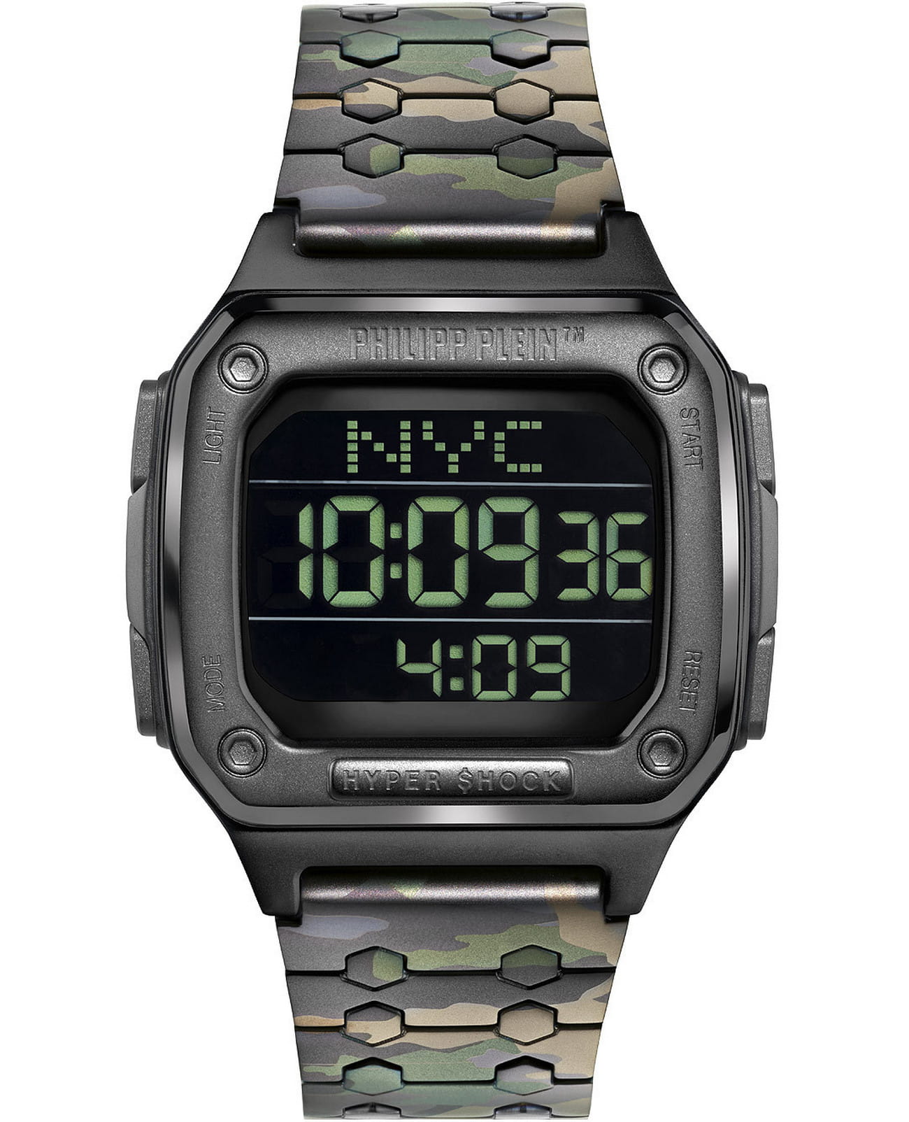 Электронные унисекс часы-хронографХронографФункция позволяет измерять отрезки времени с особой точностью: часы, минуты, секунды. Верным признаком хронографа является наличие на циферблате 3 дополнительных окошек-счётчиков. Philipp Plein Hyper Shock PWHAA0921, электронный механизм с высокой точностью. Класс водозащиты: 50 метров, позволит защитить корпус от случайных брызг или капель дождя. Прямоугольный корпус выполнен из нержавеющей стали с IP-покрытиемIP-покрытиеМетод ионного напыления. Демонстрирует повышенную устойчивость к истиранию, окислению и химическим веществам. Под воздействием высокого давления и температуры около 1500°C молекулы металла надёжно соединяются с частицами корпуса часов. цвета хаки. Браслет из нержавеющей стали шириной 22 мм, застёжка «бабочка» с кнопкамиЗастёжка "бабочка"Такой вид застёжки дополняется предохранителями, помогающими избежать случайного раскрытия браслета. Обладают изящным исполнением. .