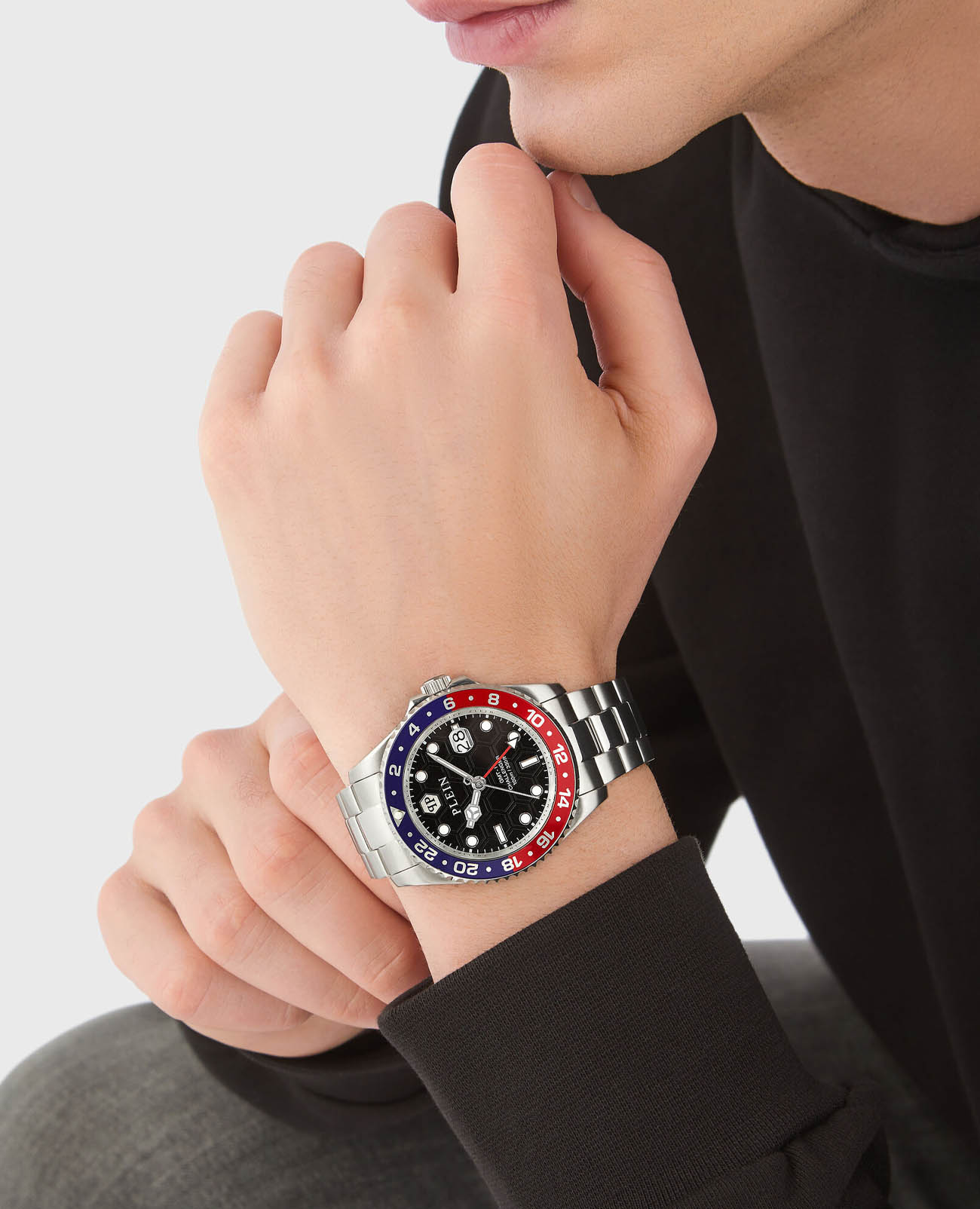 Мужские часы Philipp Plein GMT-I Challenger PWYBA0223 с надежным кварцевым механизмом. Корпус часов изготовлен из нержавеющей стали. Минеральное стеклоМинеральное стеклоМинеральное стекло представляет собой искусственно выращенный минерал кварца. Такое стекло отличается особой устойчивостью к повреждениям и царапинам. Уступает по некоторым качествам сапфировому стеклу. устойчивое к мелким механическим повреждениям. Влагозащита: 100 метров, позволит плавать, нырять и заниматься другими водными видами спорта. Стрелки и метки с люминесцентным покрытиемЛюминесцентное покрытиеПозволяет считывать показания времени в темноте. Производители наносят на стрелки, часовые индексы, безель или поверхность циферблата светонакопительный состав, дающий холодное свечение.. Окошко даты находится в положении 3 часа. Вращающийся безельБезельВнешний ободок, закрепляющий стекло. В спортивных часах так называется поворотное кольцо с делениями на циферблате, выполняет роль таймера – замеряет отрезки времени на шкале. Неподвижный безель – элемент декора. Однонаправленно вращающийся безель на дайверских часах позволяет фиксировать моменты погружения и выныривания на поверхность. с PVD-покрытиемPVDУльтратонкое покрытие наносится в технике вакуумного напыления, сочетает в себе нитрид титана особой прочности со слоем золота или оксида хрома. Несёт в себе декоративную или защитную функцию.. Стальной браслет на застёжке-бабочке с кнопкамиЗастёжка "бабочка"Такой вид застёжки дополняется предохранителями, помогающими избежать случайного раскрытия браслета. Обладают изящным исполнением. .