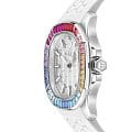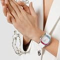 Яркие женские часы с минеральным стекломМинеральное стеклоМинеральное стекло представляет собой искусственно выращенный минерал кварца. Такое стекло отличается особой устойчивостью к повреждениям и царапинам. Уступает по некоторым качествам сапфировому стеклу. Philipp Plein PWTAA0223, кварцевый механизм с высокой точностью. Класс водозащиты: 50 метров, позволит защитить корпус от случайных брызг или капель дождя. Корпус часов изготовлен из стали с IP-покрытиемIP-покрытиеМетод ионного напыления. Демонстрирует повышенную устойчивость к истиранию, окислению и химическим веществам. Под воздействием высокого давления и температуры около 1500°C молекулы металла надёжно соединяются с частицами корпуса часов.. Стрелки и метки с люминесцентным покрытиемЛюминесцентное покрытиеПозволяет считывать показания времени в темноте. Производители наносят на стрелки, часовые индексы, безель или поверхность циферблата светонакопительный состав, дающий холодное свечение.. Стальной корпус с геометричным безелем, инкрустированным кристаллами.