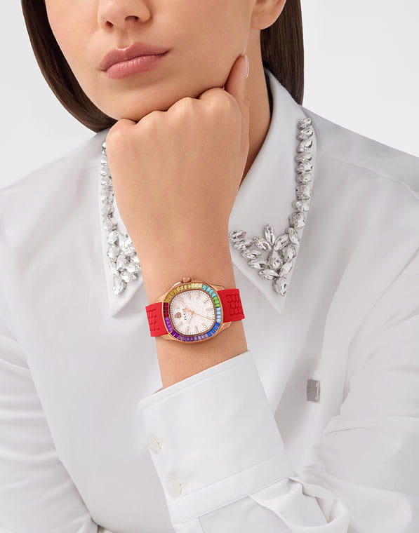 Philipp Plein THE $PECTRE LADY PWTAA1024 - дерзкое заявление любви к роскоши и бунтарскому стилю. Диаметр корпуса из прочной нержавеющей стали с PVD-покрытиемPVDУльтратонкое покрытие наносится в технике вакуумного напыления, сочетает в себе нитрид титана особой прочности со слоем золота или оксида хрома. Несёт в себе декоративную или защитную функцию. равен 38 мм. Силиконовый ремешок на стандартной застёжке обеспечивает надёжную фиксацию и комфортное ношение. Минеральное стеклоМинеральное стеклоМинеральное стекло представляет собой искусственно выращенный минерал кварца. Такое стекло отличается особой устойчивостью к повреждениям и царапинам. Уступает по некоторым качествам сапфировому стеклу. защищает циферблат от царапин. Люминесцентное покрытиеЛюминесцентное покрытиеПозволяет считывать показания времени в темноте. Производители наносят на стрелки, часовые индексы, безель или поверхность циферблата светонакопительный состав, дающий холодное свечение. стрелок и меток позволит следить за временем даже в полной темноте. БезельБезельВнешний ободок, закрепляющий стекло. В спортивных часах так называется поворотное кольцо с делениями на циферблате, выполняет роль таймера – замеряет отрезки времени на шкале. Неподвижный безель – элемент декора. Однонаправленно вращающийся безель на дайверских часах позволяет фиксировать моменты погружения и выныривания на поверхность. инкрустирован кристаллами Preciosa. Влагозащита: 50 метров, позволит защитить корпус от случайных брызг или капель дождя. Идеальный аксессуар для тех, кто ценит индивидуальность и не боится выделяться из толпы.