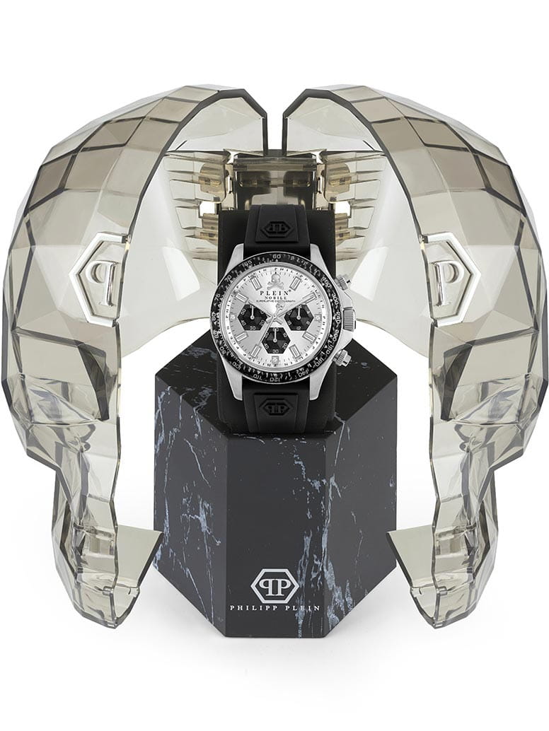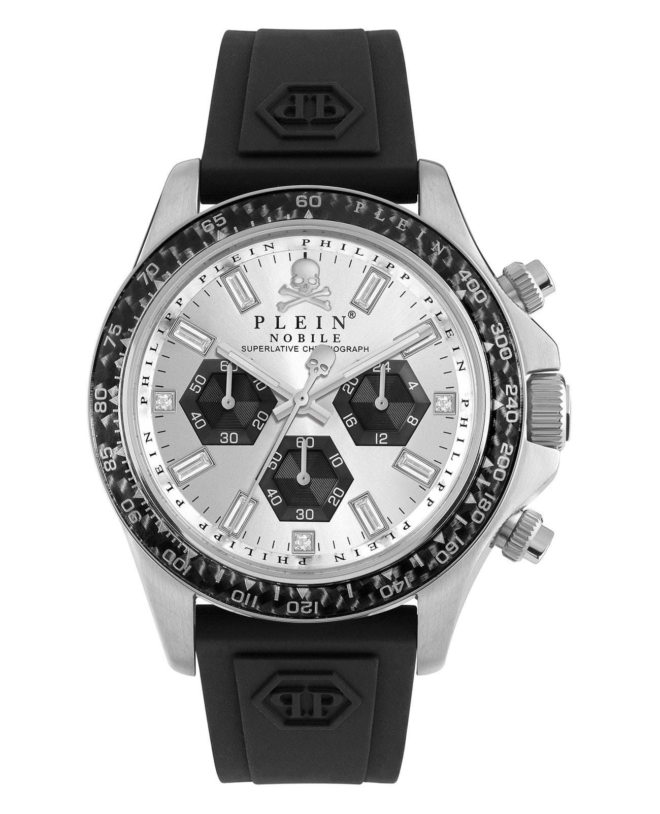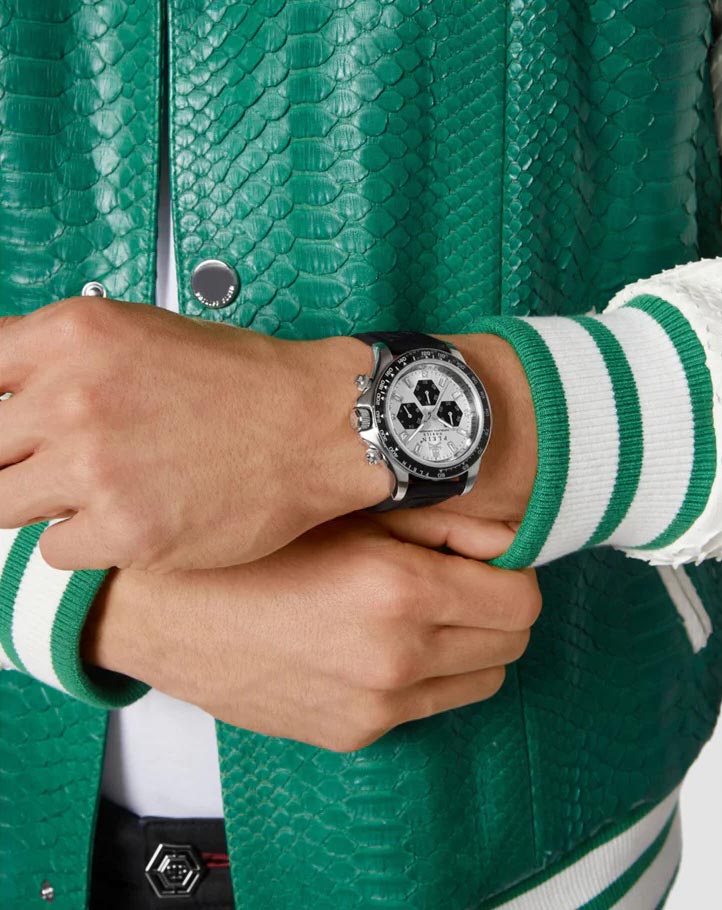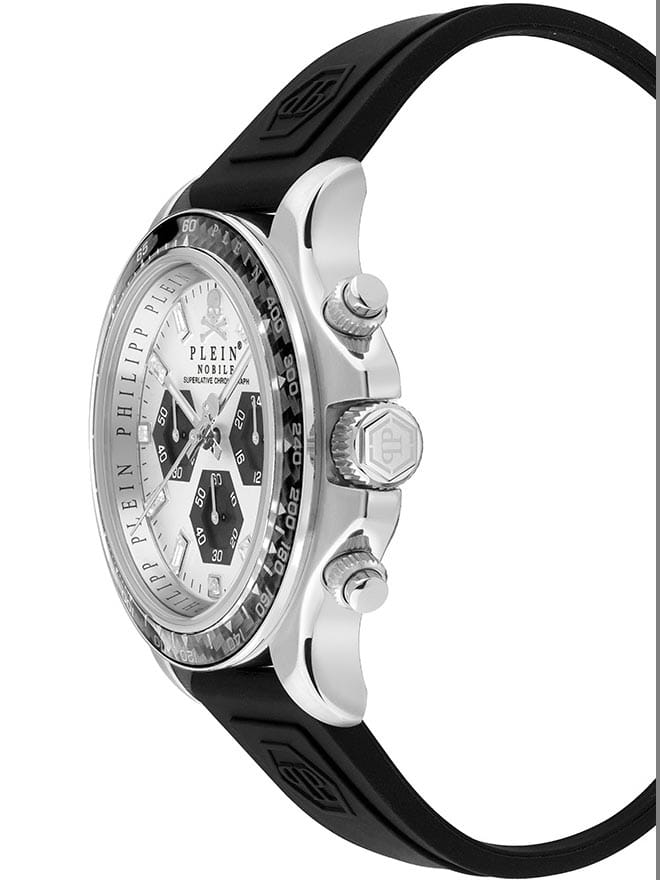 Яркие мужские часы-хронографХронографФункция позволяет измерять отрезки времени с особой точностью: часы, минуты, секунды. Верным признаком хронографа является наличие на циферблате 3 дополнительных окошек-счётчиков. Philipp Plein Nobile Racing PWVAA0523 с секундомеромСекундомерСекундоме́р — прибор, способный измерять интервалы времени с точностью до долей секунды., кварцевый механизм с высокой точностью. Класс водозащиты: 50 метров, позволит защитить корпус от случайных брызг или капель дождя. Корпус часов изготовлен из стали с IP-покрытиемIP-покрытиеМетод ионного напыления. Демонстрирует повышенную устойчивость к истиранию, окислению и химическим веществам. Под воздействием высокого давления и температуры около 1500°C молекулы металла надёжно соединяются с частицами корпуса часов., циферблат украшен кристаллами, защищен прочным минеральным стекломМинеральное стеклоМинеральное стекло представляет собой искусственно выращенный минерал кварца. Такое стекло отличается особой устойчивостью к повреждениям и царапинам. Уступает по некоторым качествам сапфировому стеклу..