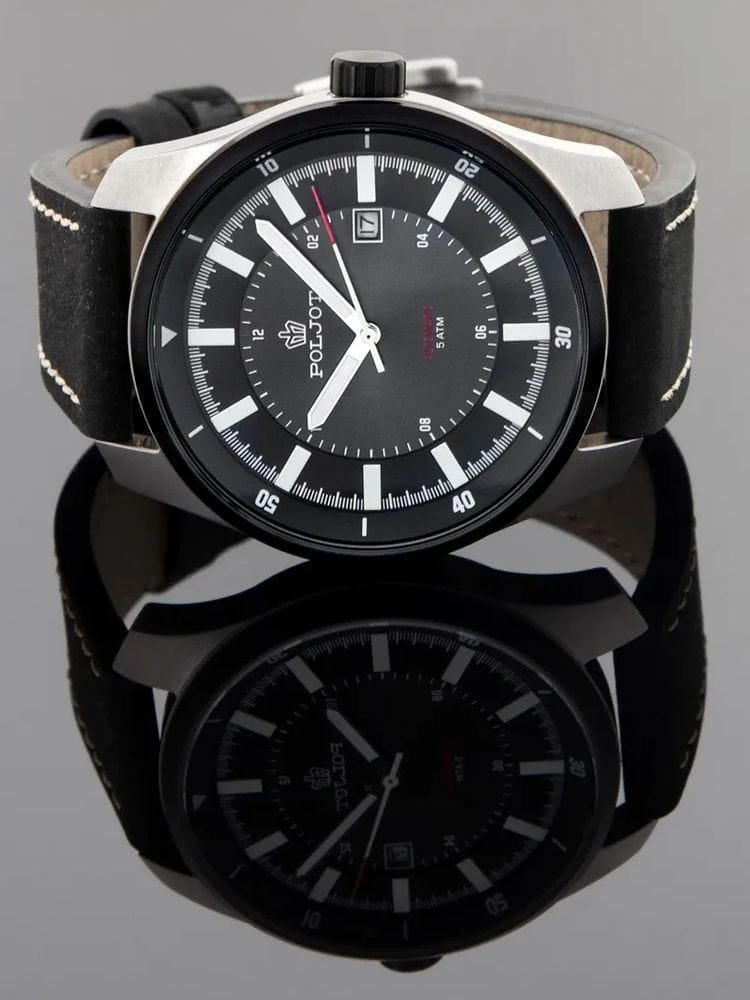 Poljot 8215.291232 — современные механические часы с автоподзаводом, воплощающие дух надёжности и динамичного стиля. Корпус из нержавеющей стали гармонично сочетается с насыщенным циферблатом, украшенным радиальным узором, а контрастные акценты придают модели выразительность и спортивный характер. БезельБезельВнешний ободок, закрепляющий стекло. В спортивных часах так называется поворотное кольцо с делениями на циферблате, выполняет роль таймера – замеряет отрезки времени на шкале. Неподвижный безель – элемент декора. Однонаправленно вращающийся безель на дайверских часах позволяет фиксировать моменты погружения и выныривания на поверхность. с PVD-покрытиемPVDУльтратонкое покрытие наносится в технике вакуумного напыления, сочетает в себе нитрид титана особой прочности со слоем золота или оксида хрома. Несёт в себе декоративную или защитную функцию.. В основе конструкции — проверенный японский калибр Miyota 8215, обеспечивающий точный ход и плавное движение стрелок. Метки и стрелки с люминесцентным покрытиемЛюминесцентное покрытиеПозволяет считывать показания времени в темноте. Производители наносят на стрелки, часовые индексы, безель или поверхность циферблата светонакопительный состав, дающий холодное свечение. обеспечивают отличную читаемость даже в условиях слабого освещения. Окно даты, подчеркивая симметрию дизайна. Прочное минеральное стеклоМинеральное стеклоМинеральное стекло представляет собой искусственно выращенный минерал кварца. Такое стекло отличается особой устойчивостью к повреждениям и царапинам. Уступает по некоторым качествам сапфировому стеклу. надёжно защищает циферблат, а ремешок из натуральной кожи с контрастной строчкой придаёт модели уют и стиль. Poljot — универсальные часы для мужчины, ценящего механическую точность и уверенный, сдержанный стиль в каждой детали.