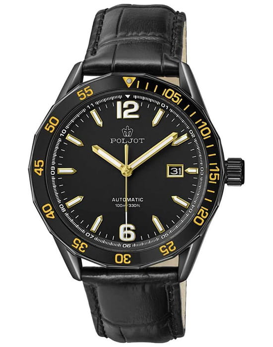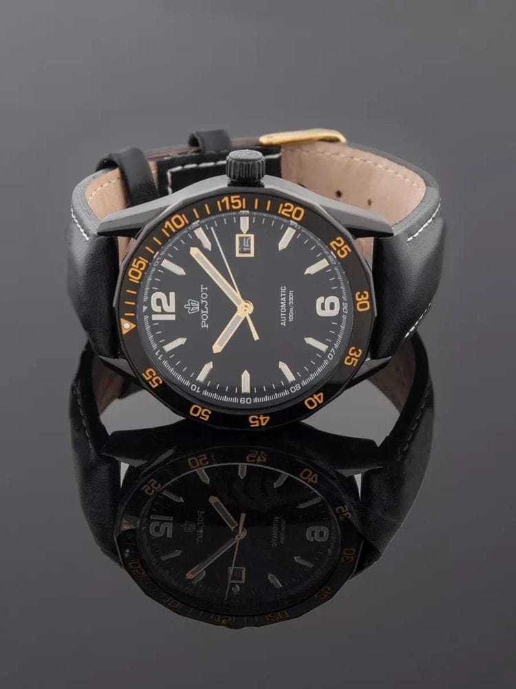 Poljot NH35A.184265 — надёжные механические мужские часы с автоподзаводом, сочетающие техническую точность и выразительный спортивный стиль. Корпус из нержавеющей стали  с PVD-покрытиемPVDУльтратонкое покрытие наносится в технике вакуумного напыления, сочетает в себе нитрид титана особой прочности со слоем золота или оксида хрома. Несёт в себе декоративную или защитную функцию. подчёркивает прочность конструкции, а насыщенный циферблат с акцентами на стрелках и метках придаёт модели динамичный и современный облик. БезельБезельВнешний ободок, закрепляющий стекло. В спортивных часах так называется поворотное кольцо с делениями на циферблате, выполняет роль таймера – замеряет отрезки времени на шкале. Неподвижный безель – элемент декора. Однонаправленно вращающийся безель на дайверских часах позволяет фиксировать моменты погружения и выныривания на поверхность. с PVD-покрытиемPVDУльтратонкое покрытие наносится в технике вакуумного напыления, сочетает в себе нитрид титана особой прочности со слоем золота или оксида хрома. Несёт в себе декоративную или защитную функцию.. Внутри установлен проверенный японский механизм SEIKO NH35, обеспечивающий стабильную работу и плавный ход секундной стрелки. Окно даты добавляет функциональности, а широкие метки с люминесцентным покрытиемЛюминесцентное покрытиеПозволяет считывать показания времени в темноте. Производители наносят на стрелки, часовые индексы, безель или поверхность циферблата светонакопительный состав, дающий холодное свечение. обеспечивают отличную читаемость даже в темноте. Прочное минеральное стеклоМинеральное стеклоМинеральное стекло представляет собой искусственно выращенный минерал кварца. Такое стекло отличается особой устойчивостью к повреждениям и царапинам. Уступает по некоторым качествам сапфировому стеклу. защищает циферблат от царапин, а ремешок из натуральной кожи с контрастной прострочкой гарантирует комфорт и надёжную посадку. Poljot — часы с характером, созданные для тех, кто ценит точность, качество и спортивную уверенность в каждой детали.