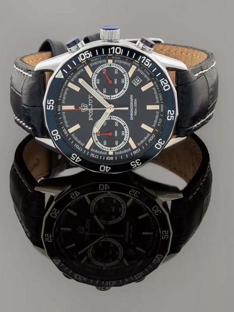 Poljot 6S21.181257 — яркие мужские часы с выразительным спортивным характером и акцентом на функциональность. Корпус из нержавеющей стали придаёт модели надёжность и солидность, а насыщенный циферблат с контрастными счётчиками хронографаХронографФункция позволяет измерять отрезки времени с особой точностью: часы, минуты, секунды. Верным признаком хронографа является наличие на циферблате 3 дополнительных окошек-счётчиков. создаёт динамичный и энергичный облик. БезельБезельВнешний ободок, закрепляющий стекло. В спортивных часах так называется поворотное кольцо с делениями на циферблате, выполняет роль таймера – замеряет отрезки времени на шкале. Неподвижный безель – элемент декора. Однонаправленно вращающийся безель на дайверских часах позволяет фиксировать моменты погружения и выныривания на поверхность. с PVD-покрытиемPVDУльтратонкое покрытие наносится в технике вакуумного напыления, сочетает в себе нитрид титана особой прочности со слоем золота или оксида хрома. Несёт в себе декоративную или защитную функцию.. Широкие стрелки и метки с люминесцентным покрытиемЛюминесцентное покрытиеПозволяет считывать показания времени в темноте. Производители наносят на стрелки, часовые индексы, безель или поверхность циферблата светонакопительный состав, дающий холодное свечение. обеспечивают отличную читаемость в любых условиях, а внешний обод с минутной шкалой подчёркивает спортивный стиль. Окно даты добавляет практичности. Прочное минеральное стеклоМинеральное стеклоМинеральное стекло представляет собой искусственно выращенный минерал кварца. Такое стекло отличается особой устойчивостью к повреждениям и царапинам. Уступает по некоторым качествам сапфировому стеклу. надёжно защищает циферблат от повреждений, а ремешок из натуральной кожи гармонично дополняет контрастную цветовую палитру. Poljot — это смелое сочетание спортивной энергии, точности и современного дизайна для активного и уверенного мужчины.